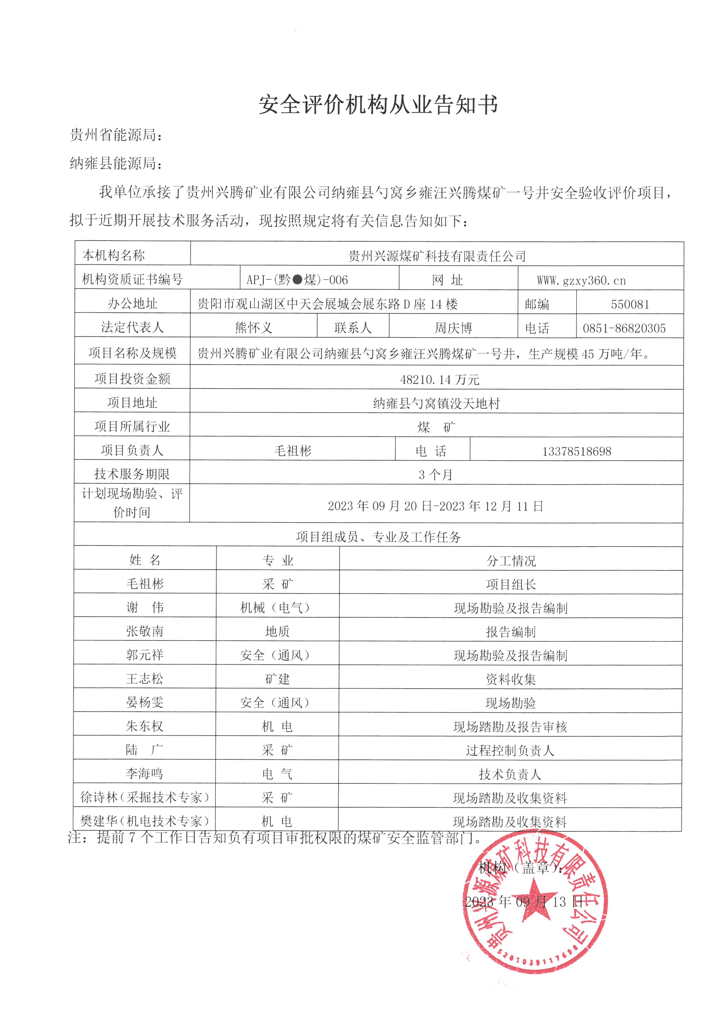 安全評價機構從業(yè)告知書【貴州興騰礦業(yè)有限公司納雍縣勺窩鄉(xiāng)雍汪興騰煤礦一號井安全驗收評價項目】