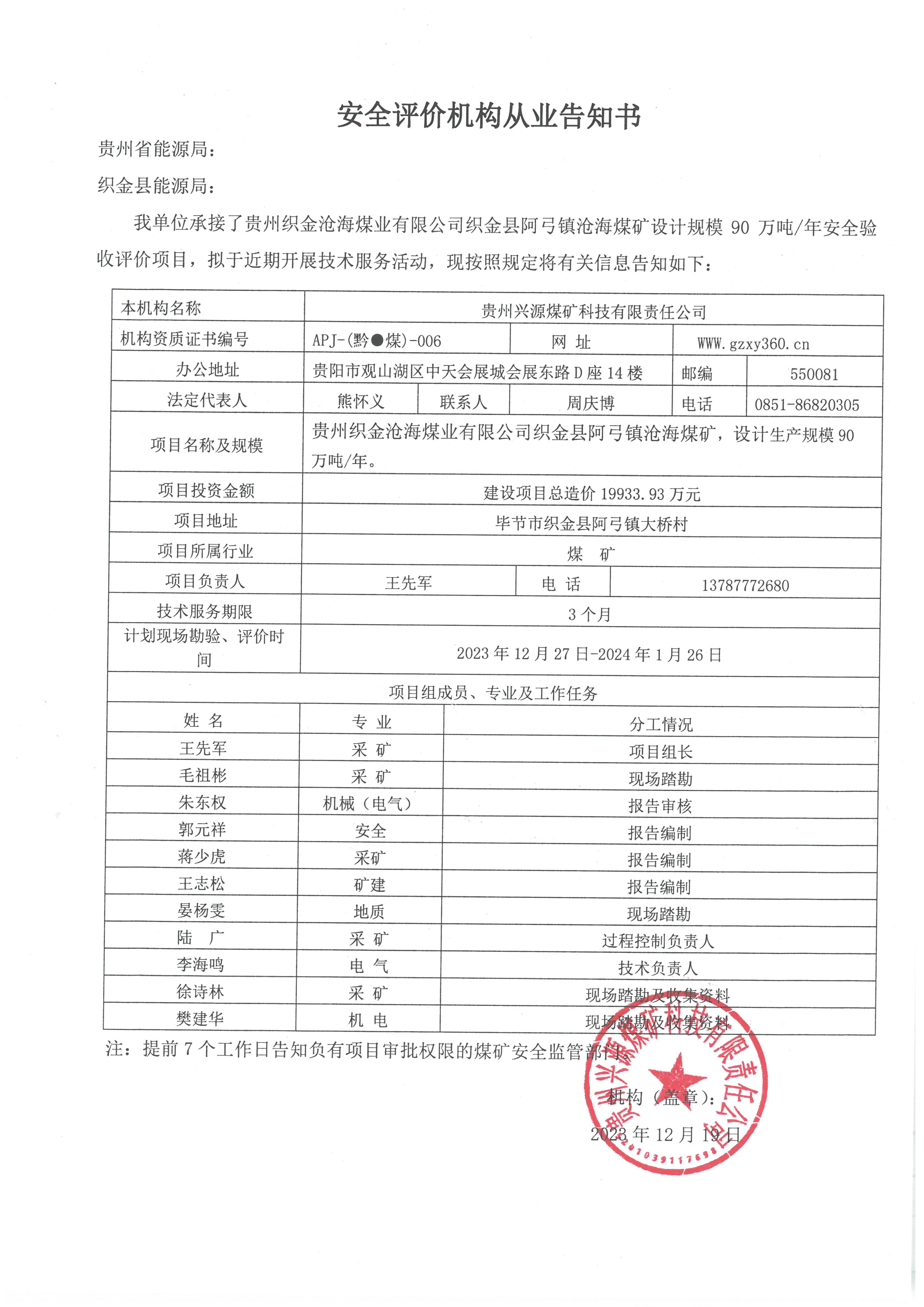 安全評價機構從業(yè)告知書【貴州織金滄海煤業(yè)有限公司織金縣阿弓鎮(zhèn)滄海煤礦】
