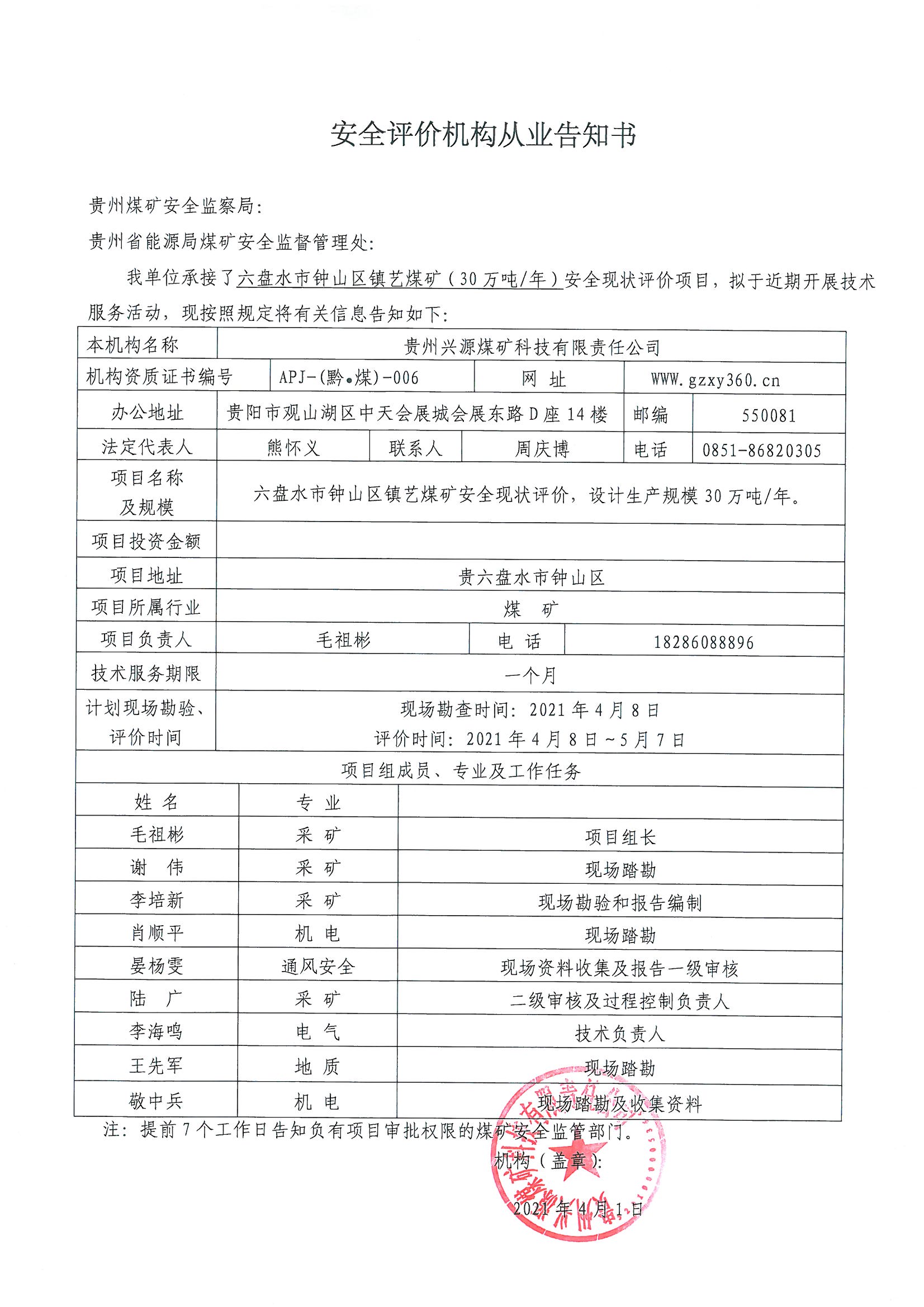 安全評價機構從業告知書(六盤水市鐘山區鎮藝煤礦(30萬噸年))