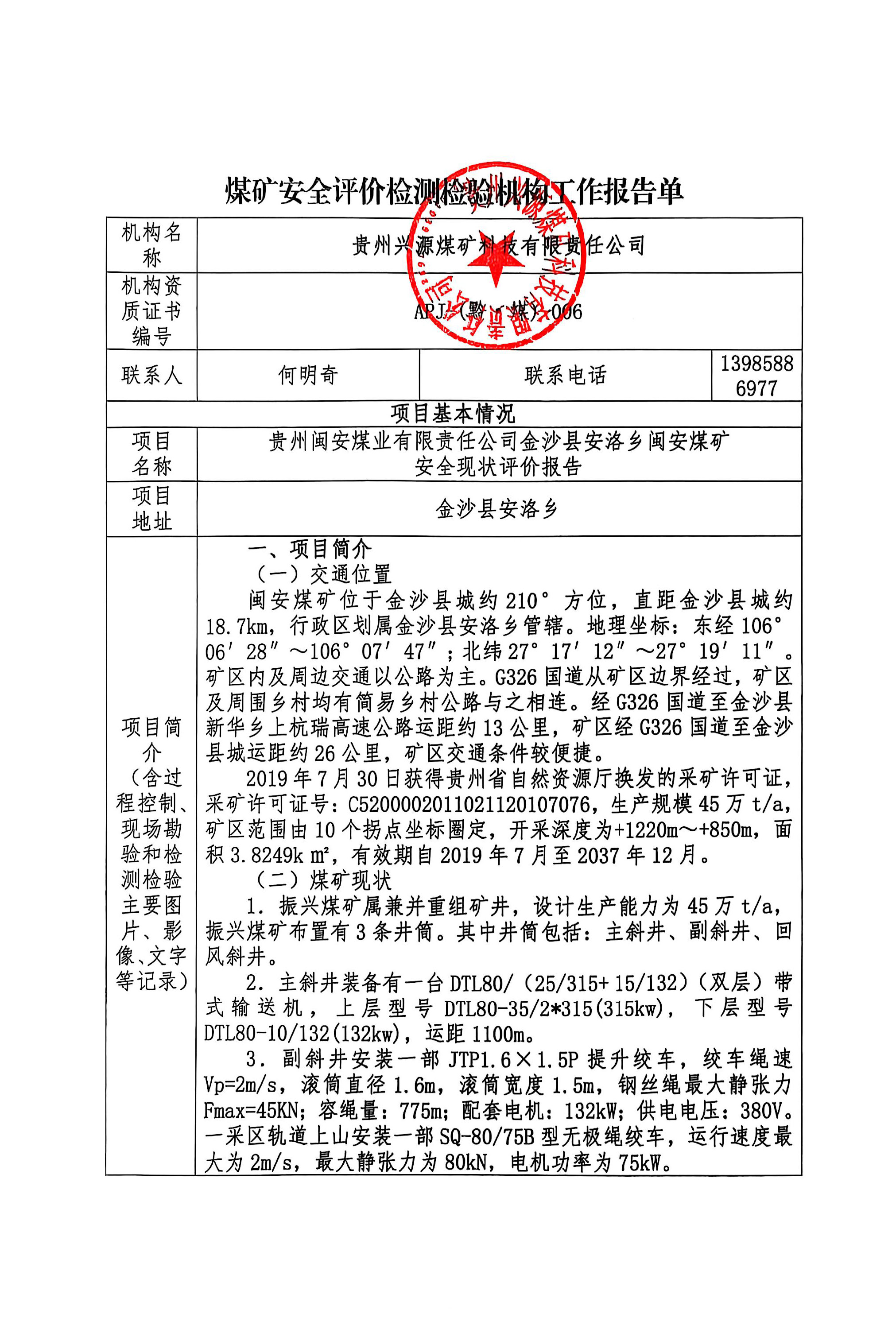 煤礦安全評價檢測檢驗機構工作報告單【貴州閩安煤業有限責任公司金沙縣安洛鄉閩安煤礦安全現狀評價報告】