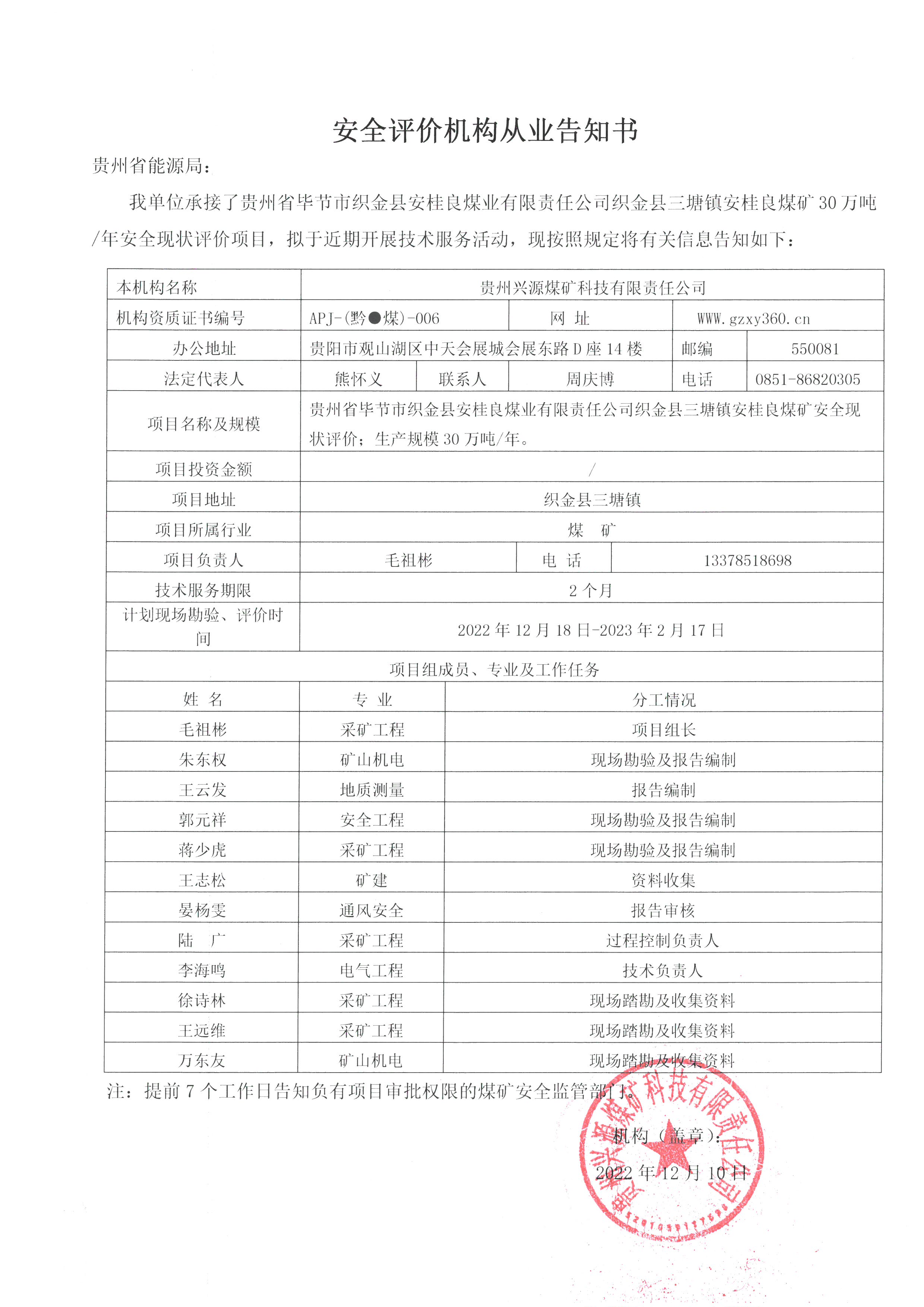 安全評價機構從業告知書【貴州省畢節市織金縣安桂良煤業有限責任公司織金縣三塘鎮安桂良煤礦】