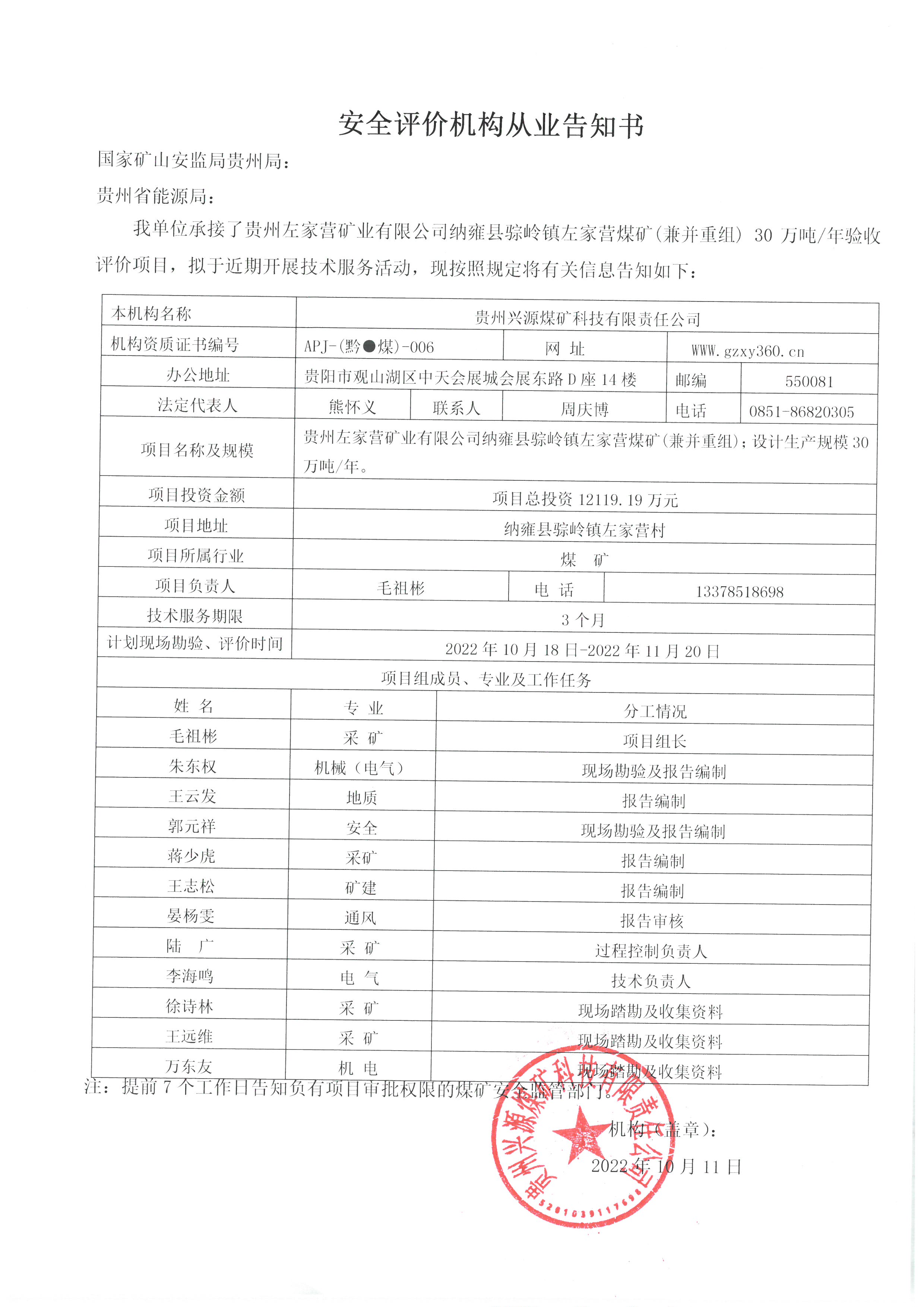 安全評價機構從業告知書【貴州左家營礦業有限公司納雍縣骔嶺鎮左家營煤礦(兼并重組) 30萬噸/年驗收評價】