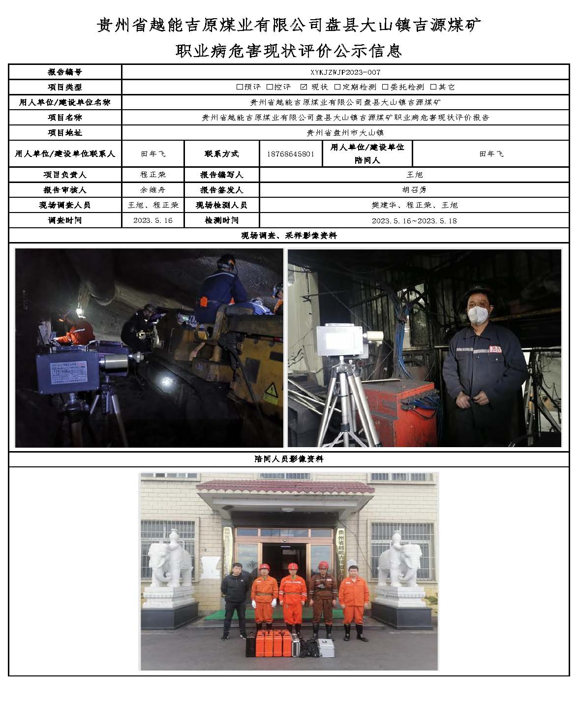 貴州省越能吉原煤業有限公司盤縣大山鎮吉源煤礦職業病危害現狀評價公示信息
