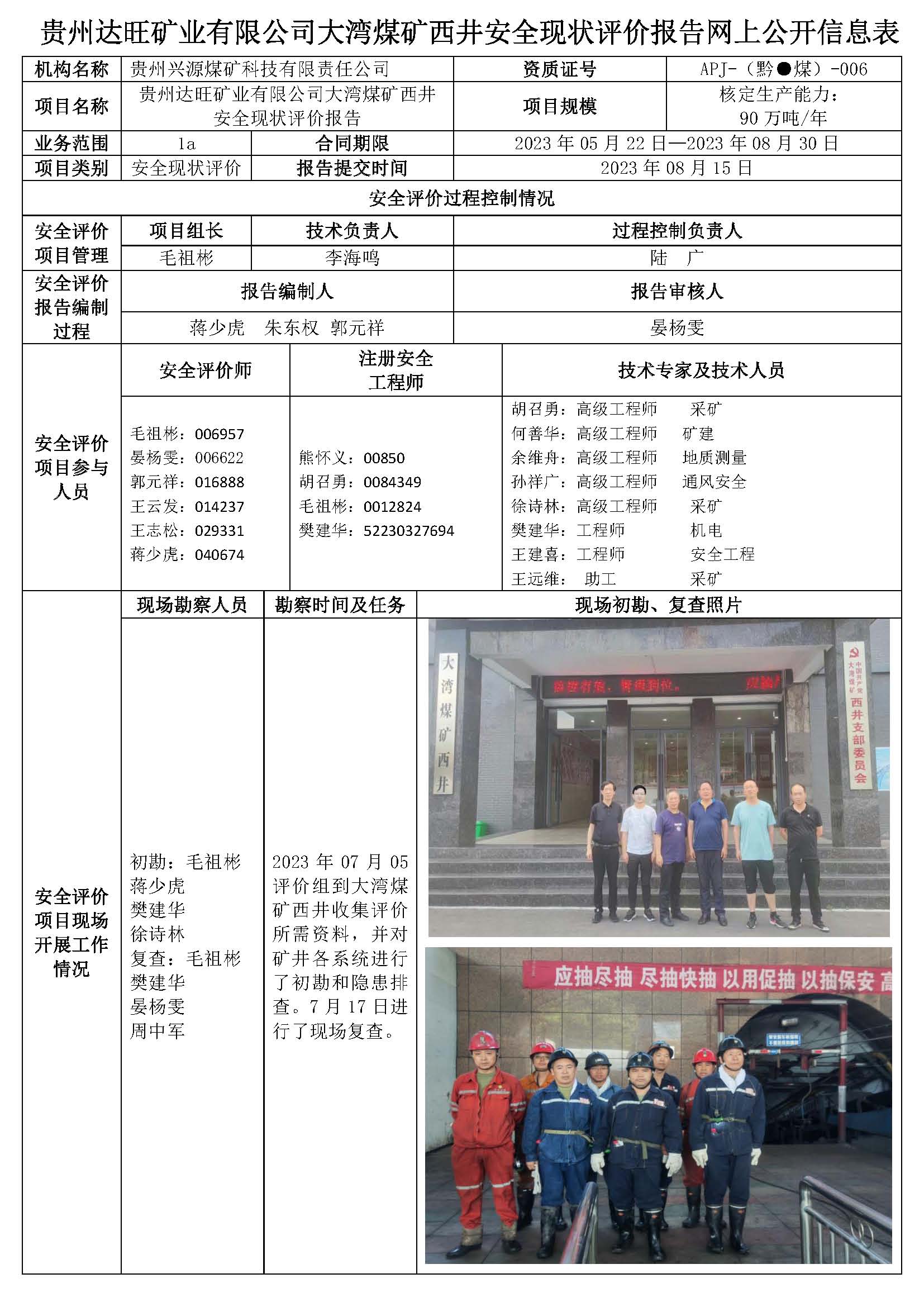 貴州達旺礦業有限公司大灣煤礦西井安全現狀評價報告網上公開信息表