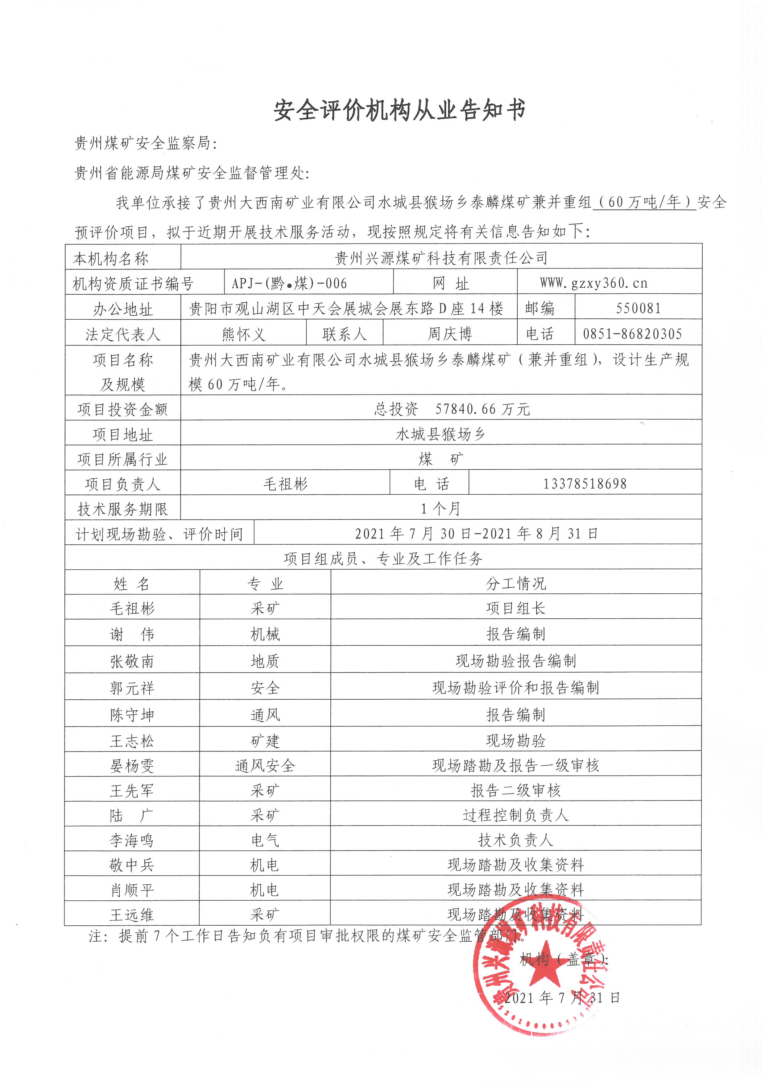 安全評價機構從業告知書(貴州大西南礦業有限公司水城縣猴場鄉泰麟煤礦兼并重組(60萬噸年)安全預評價)
