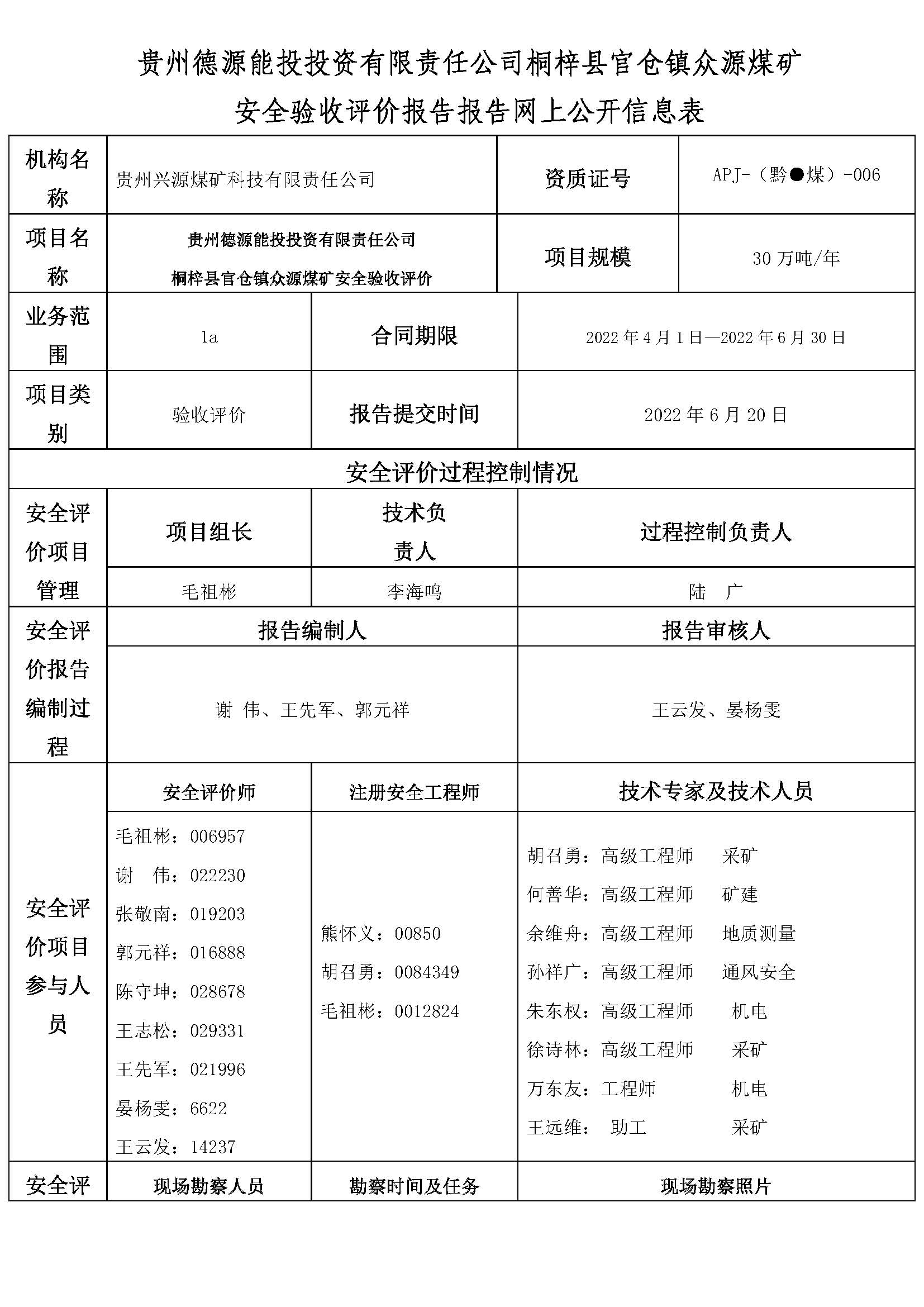 貴州德源能投投資有限責任公司桐梓縣官倉鎮眾源煤礦安全驗收評價報告報告網上公開信息表