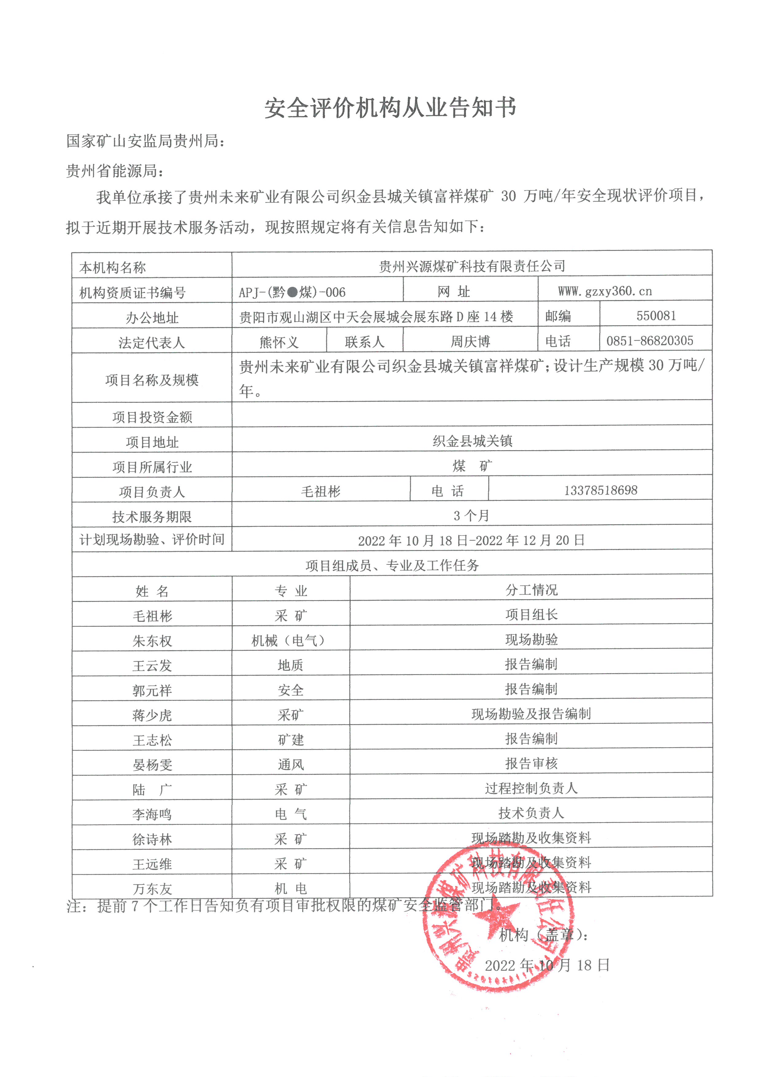 安全評價機構從業告知書【織金縣城關鎮富祥煤礦30萬噸/年安全現狀評價】