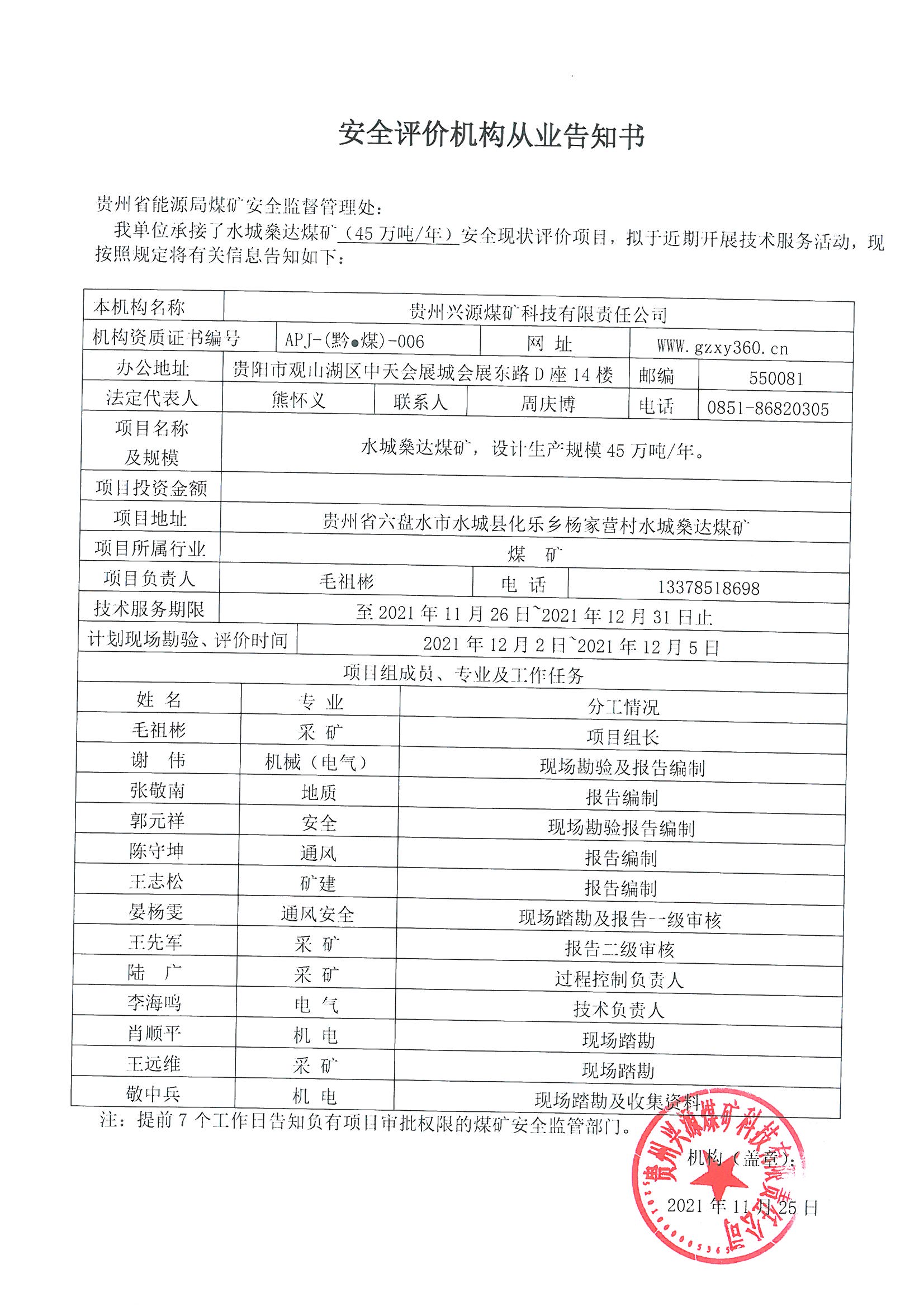安全評價機構從業告知書(水城燊達煤礦(45萬噸/年)安全現狀評價)