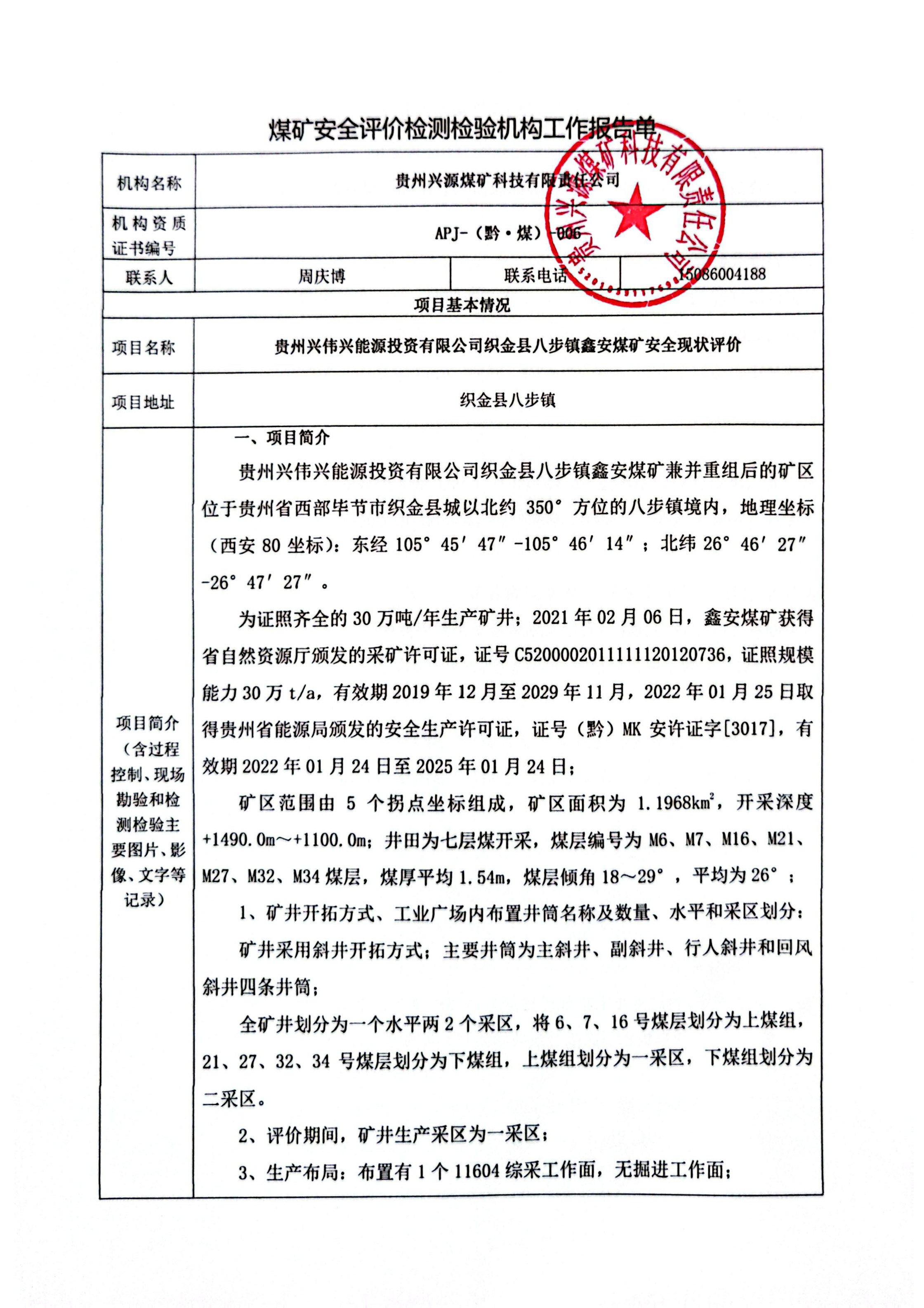 煤礦安全評價檢測檢驗機構工作報告單【貴州興偉興能源投資有限公司織金縣八步鎮鑫安煤礦安全現狀評價】
