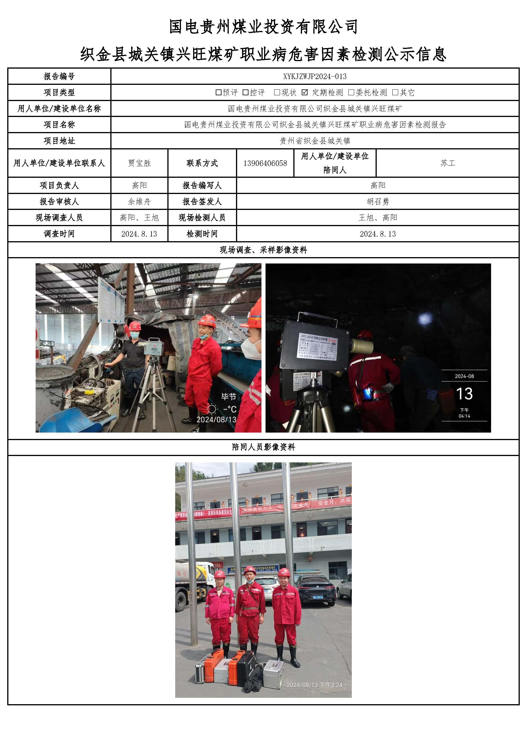 國電貴州煤業投資有限公司織金縣城關鎮興旺煤礦職業病危害因素檢測公示信息