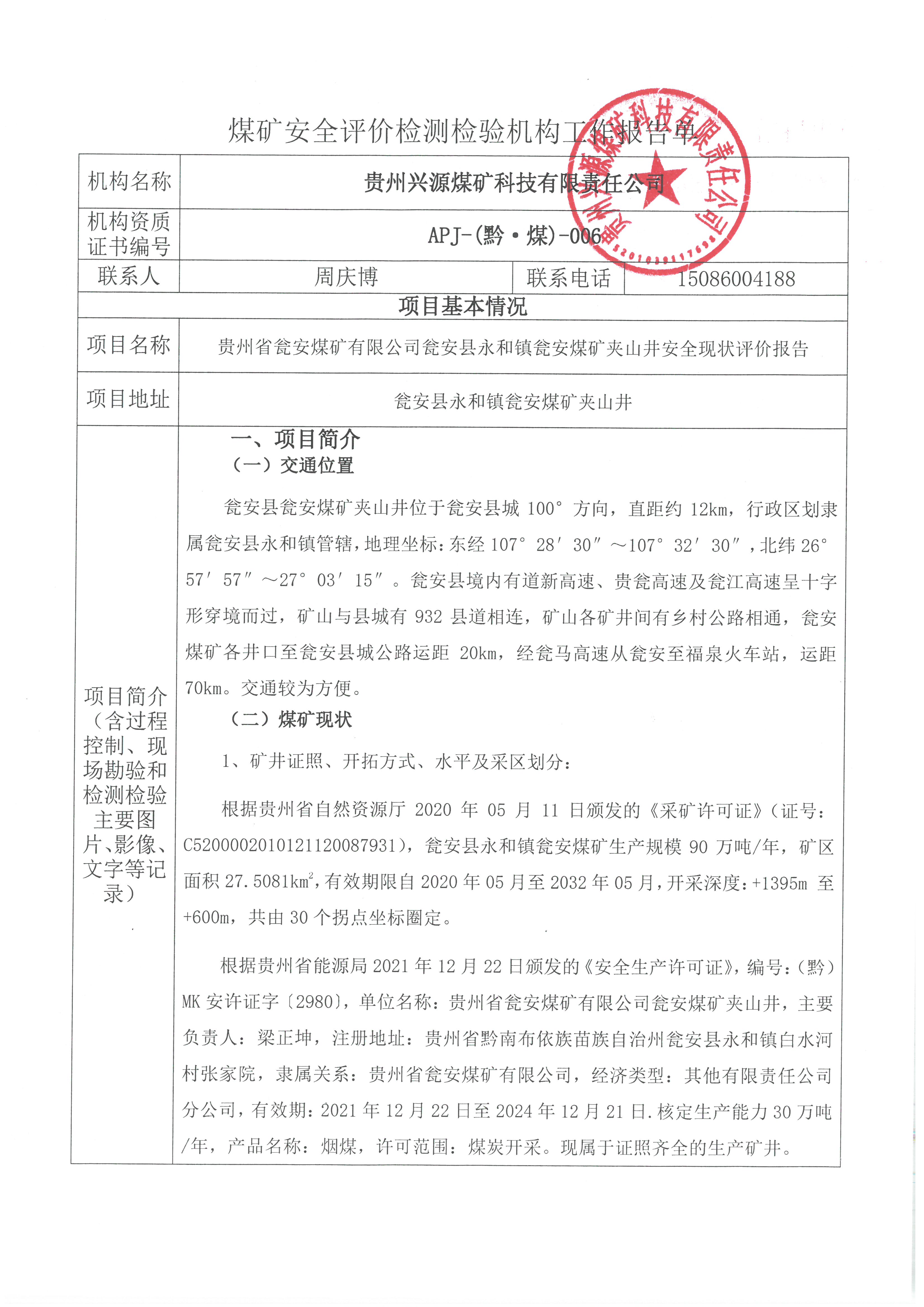 煤礦安全評價檢測檢驗機構工作報告單[貴州省甕安煤礦有限公司甕安縣永和鎮甕安煤礦夾山井安全現狀評價報告]