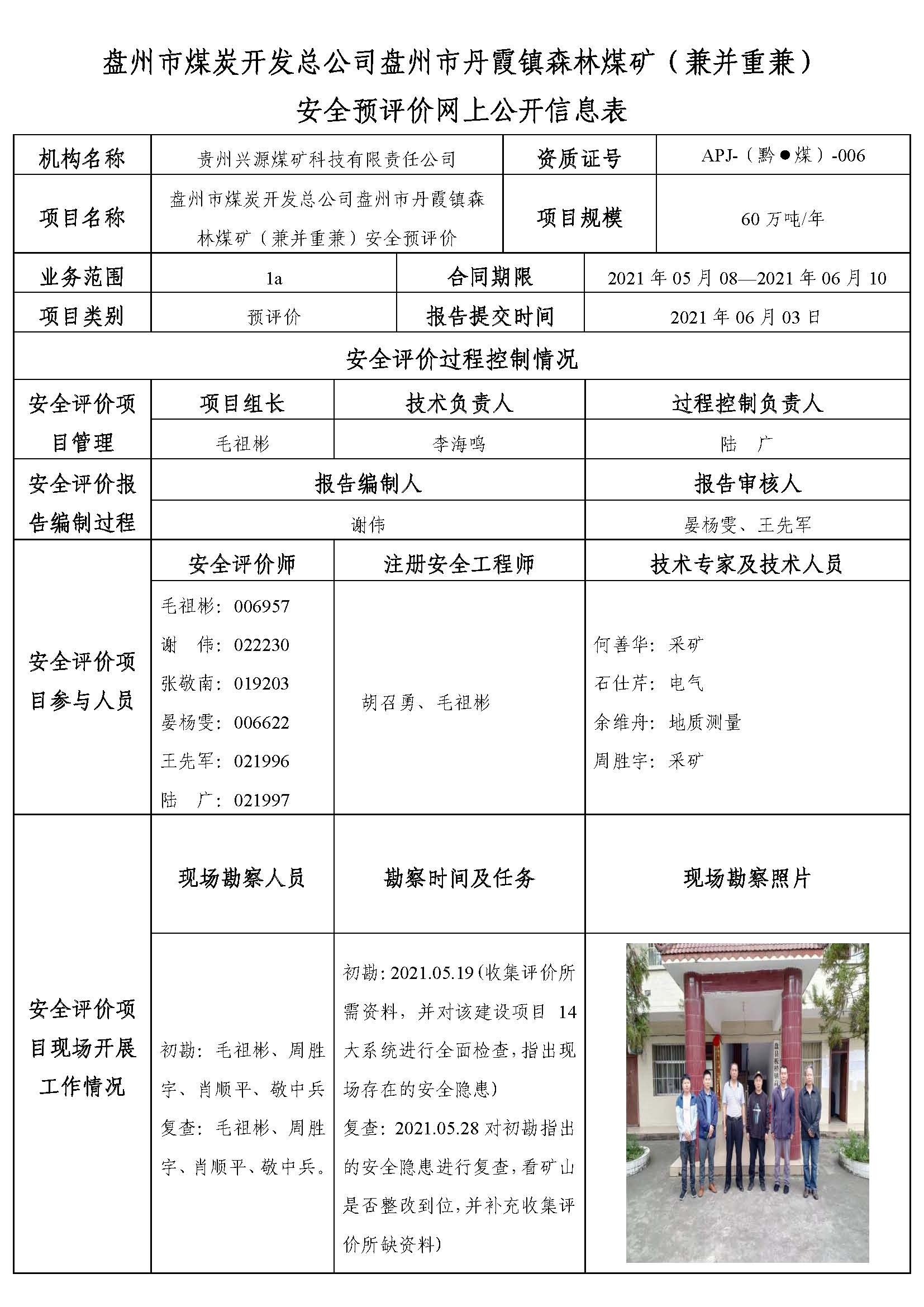盤州市煤炭開發(fā)總公司盤州市丹霞鎮(zhèn)森林煤礦(兼并重兼)安全預(yù)評價網(wǎng)上公開信息表