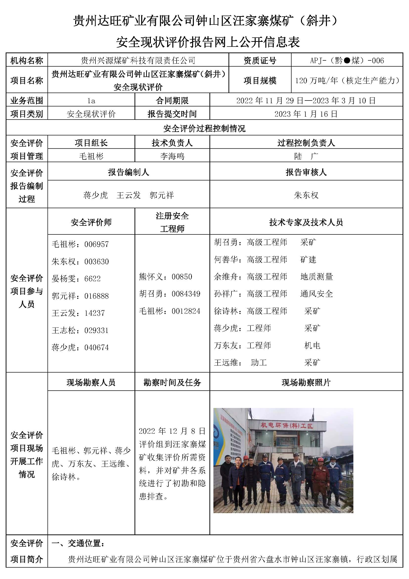 貴州達(dá)旺礦業(yè)有限公司鐘山區(qū)汪家寨煤礦(斜井)安全現(xiàn)狀評價報告網(wǎng)上公開信息表