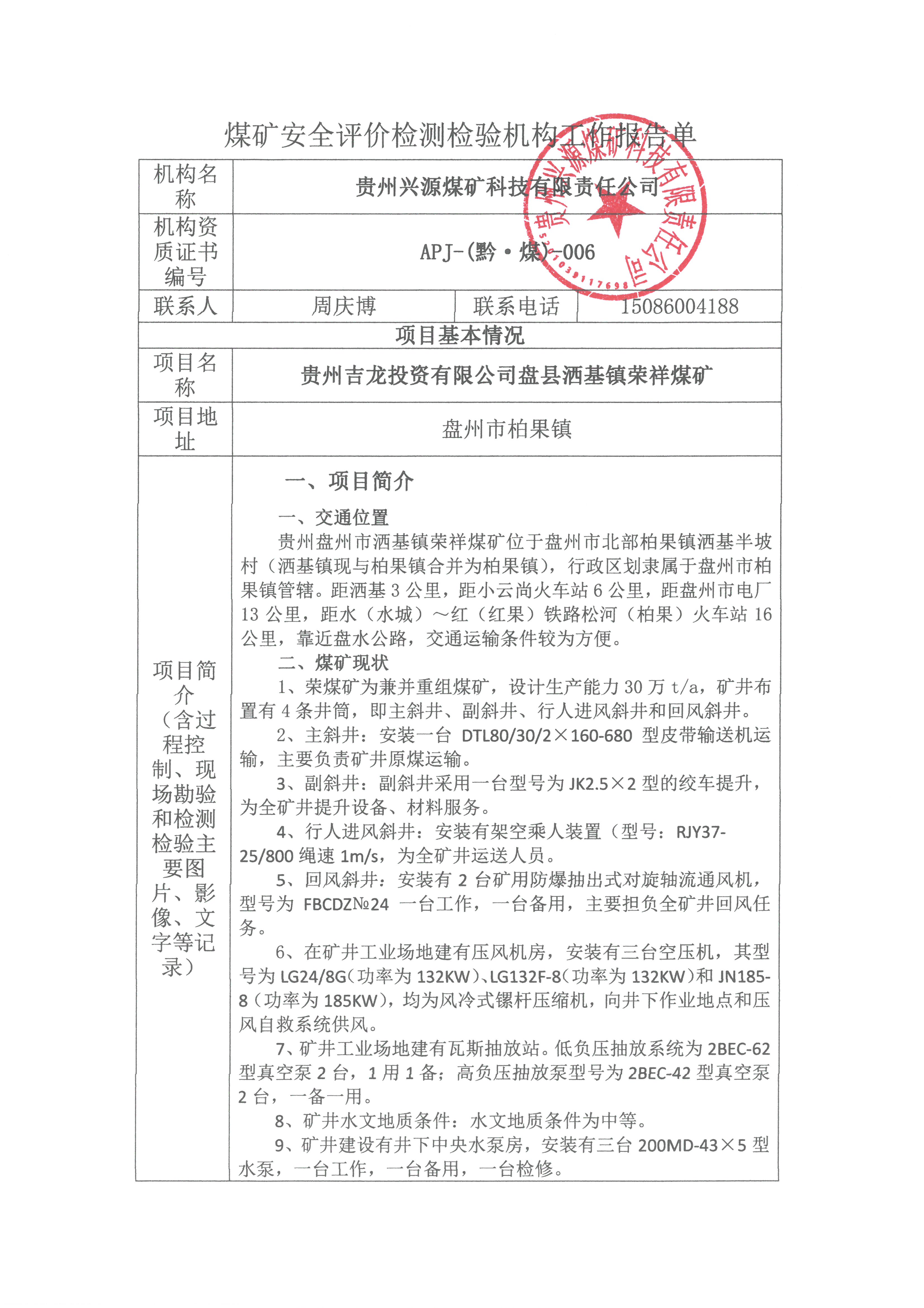 煤礦安全評價檢測檢驗機(jī)構(gòu)工作報告單【貴州吉龍投資有限公司盤縣灑基鎮(zhèn)榮祥煤礦安全現(xiàn)狀評價】