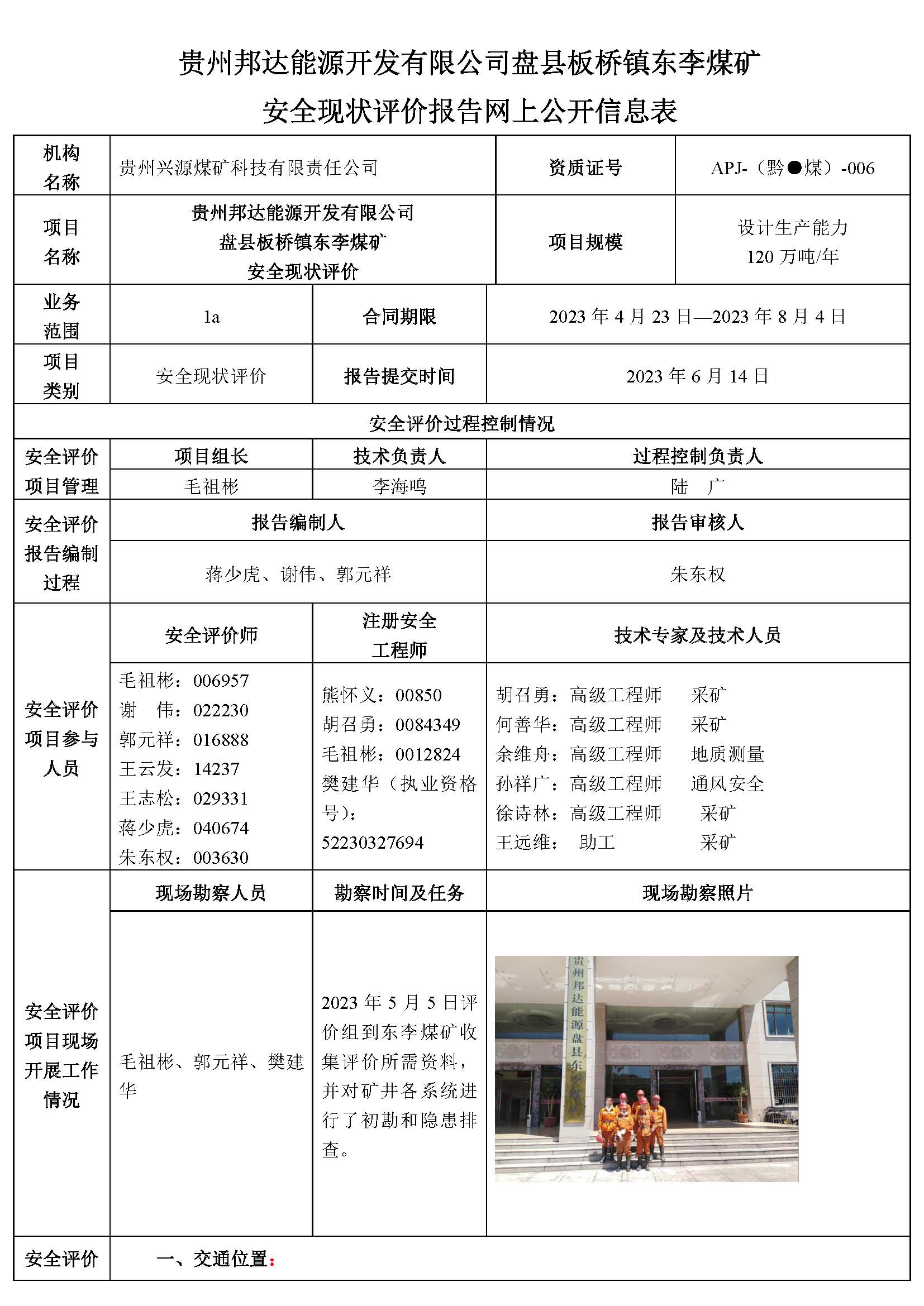 貴州邦達(dá)能源開發(fā)有限公司盤縣板橋鎮(zhèn)東李煤礦 安全現(xiàn)狀評價報告網(wǎng)上公開信息表