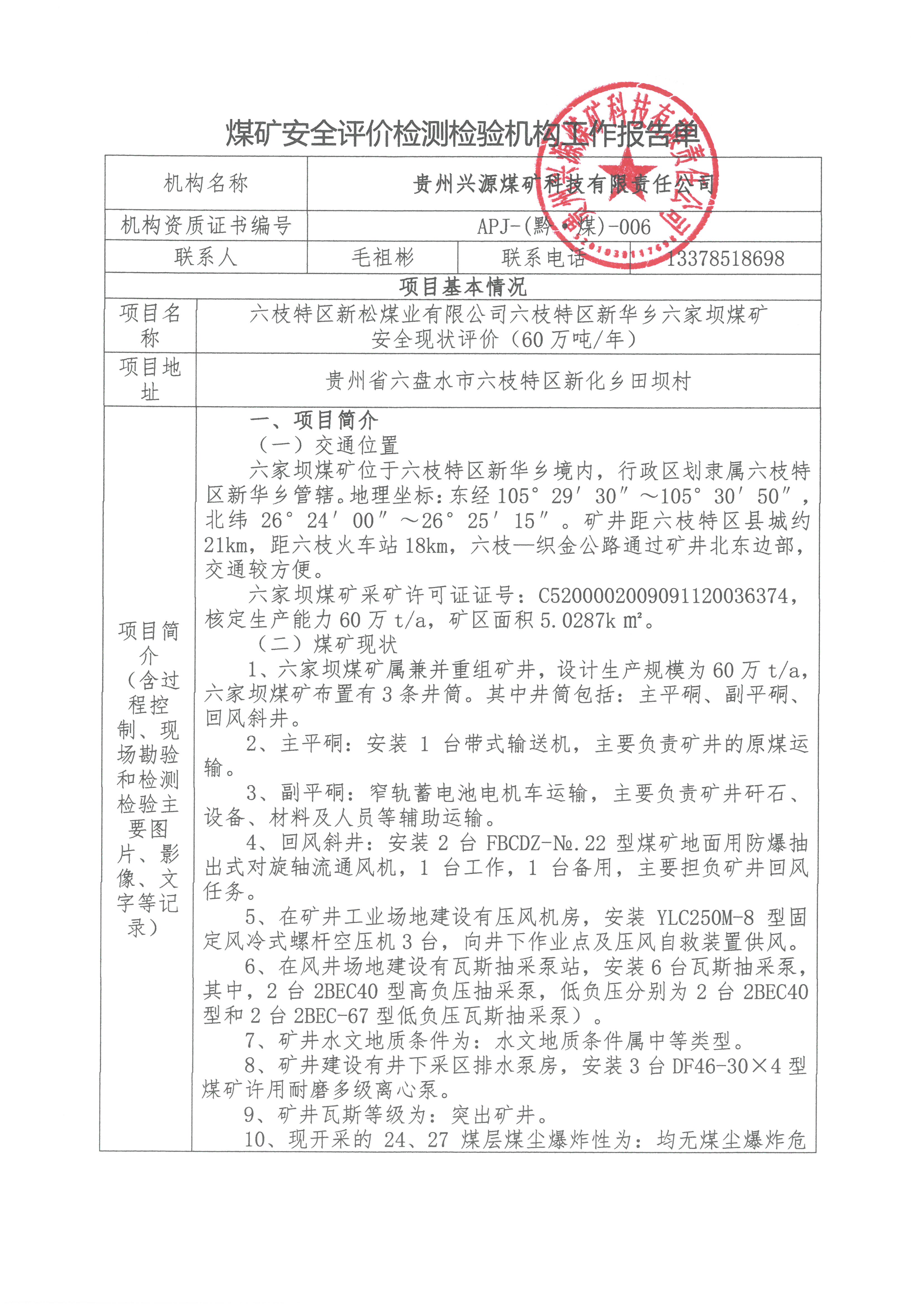 煤礦安全評價檢測檢驗機(jī)構(gòu)工作報告單【六枝特區(qū)新松煤業(yè)有限公司六枝特區(qū)新華鄉(xiāng)六家壩煤礦安全現(xiàn)狀評價】