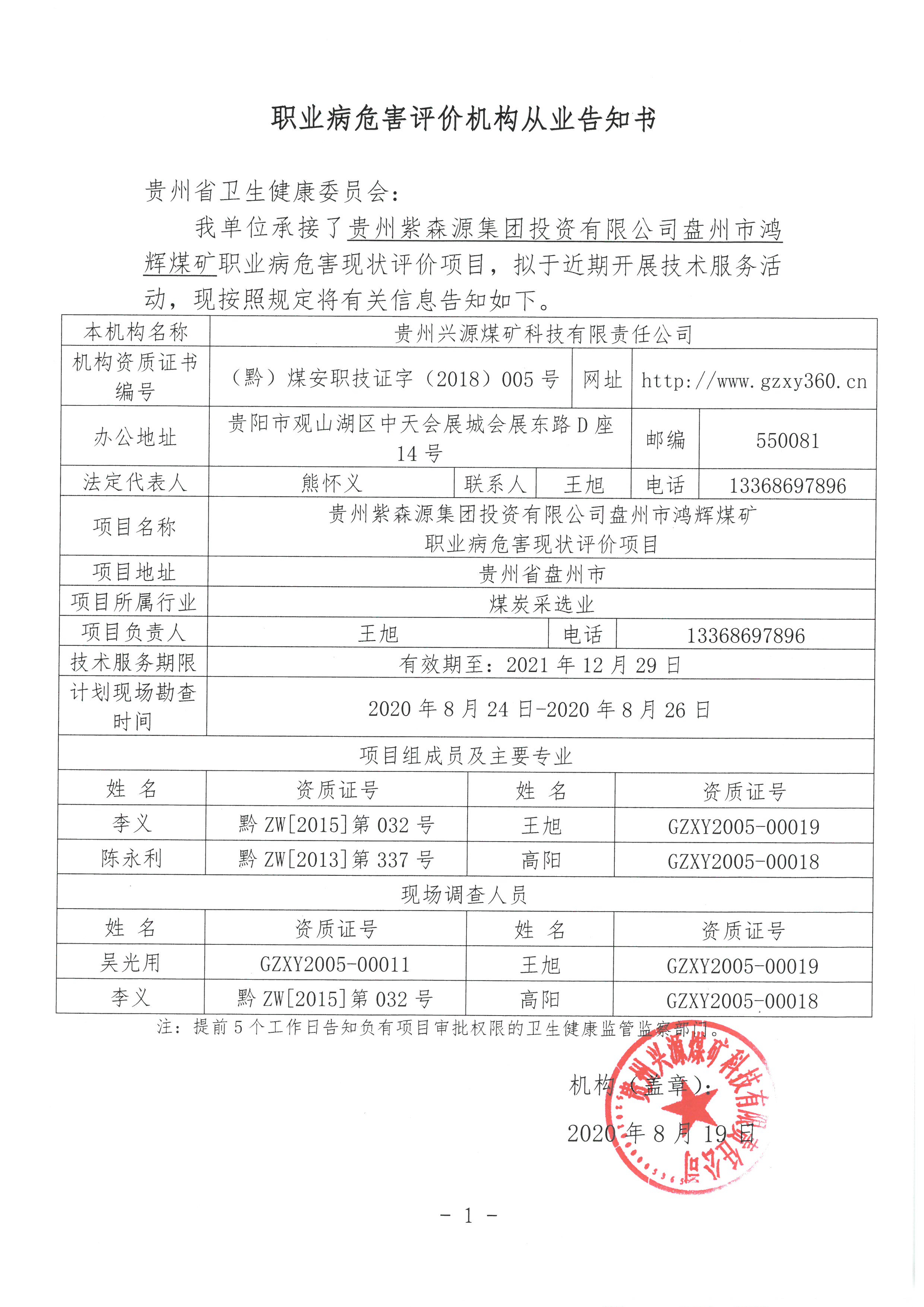 職業病危害評價機構從業告知書【貴州紫森源集團投資有限公司盤州市鴻輝煤礦】