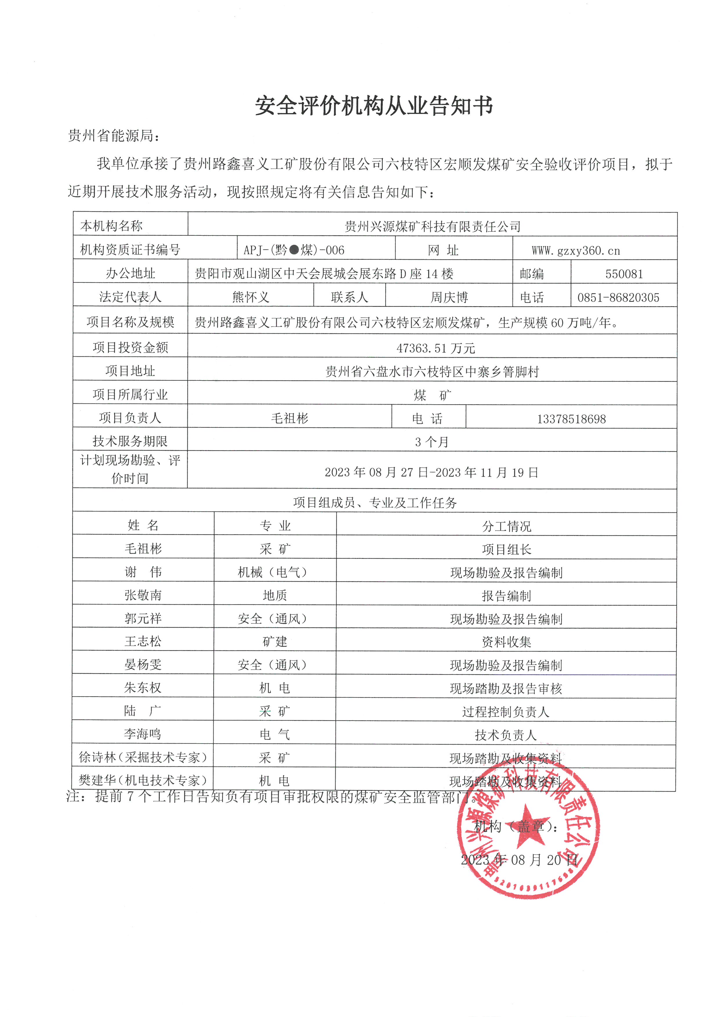 安全評價機構從業告知書[貴州路鑫喜義工礦股份有限公司六枝特區宏順發煤礦]