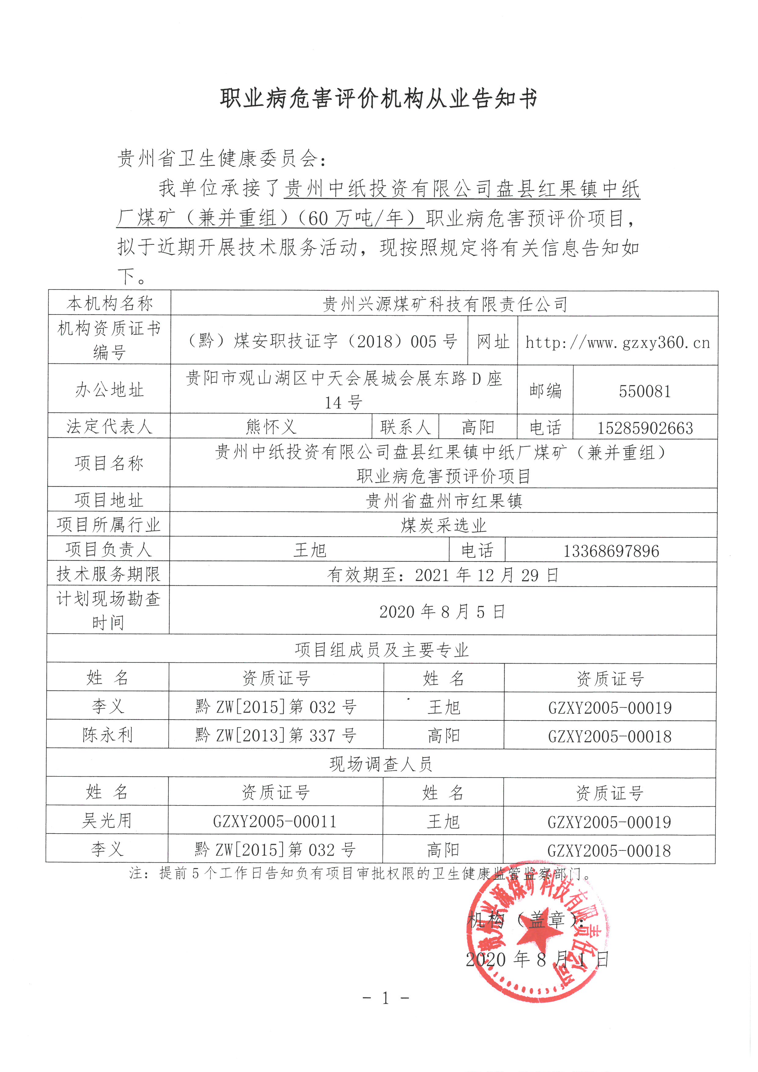 職業(yè)病危害評價機構(gòu)從業(yè)告知書【貴州中紙投資有限公司盤縣紅果鎮(zhèn)中紙廠煤礦(兼并重組)】