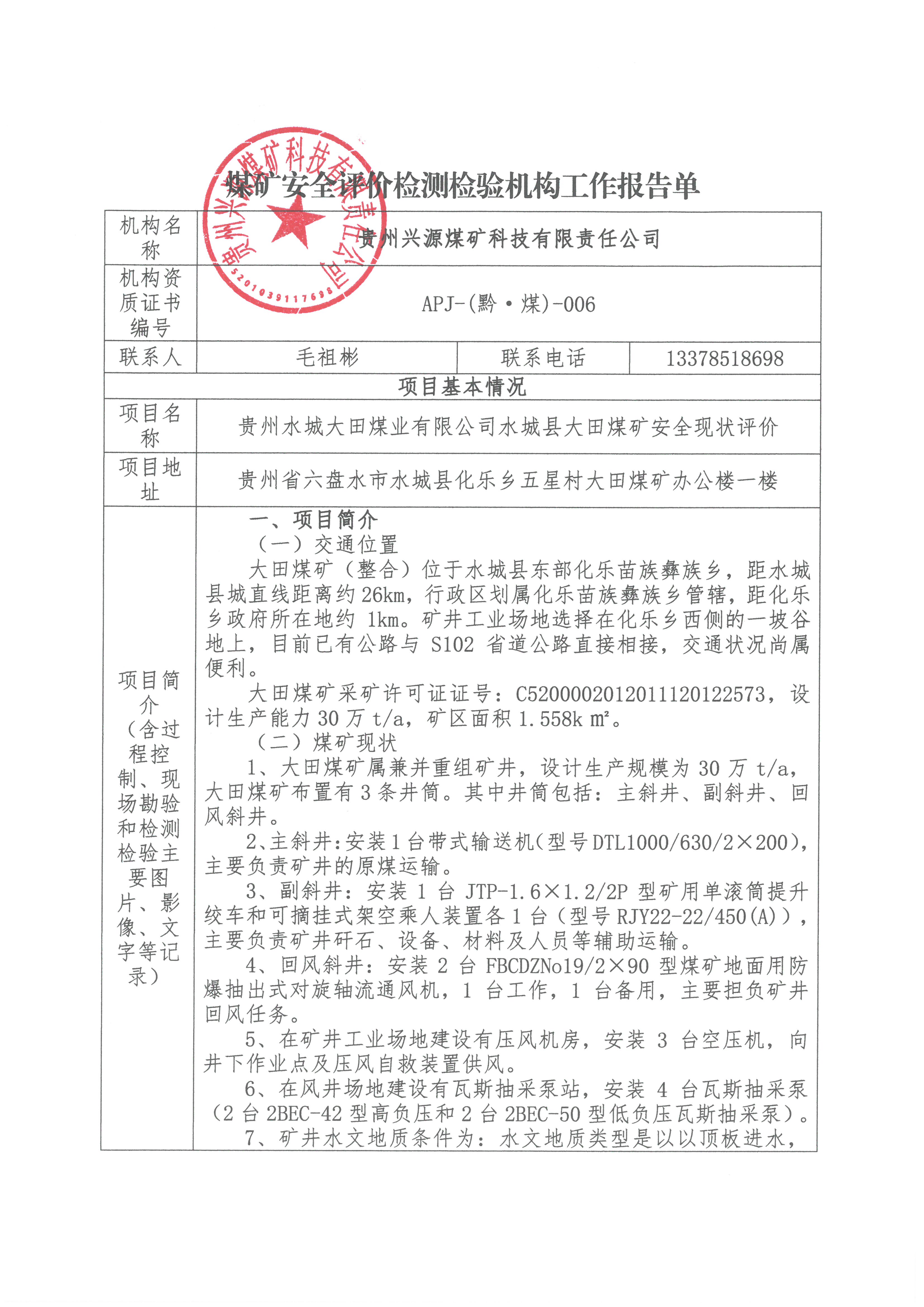 煤礦安全評價檢測檢驗機構(gòu)工作報告單【貴州水城大田煤業(yè)有限公司水城縣大田煤礦安全現(xiàn)狀評價】