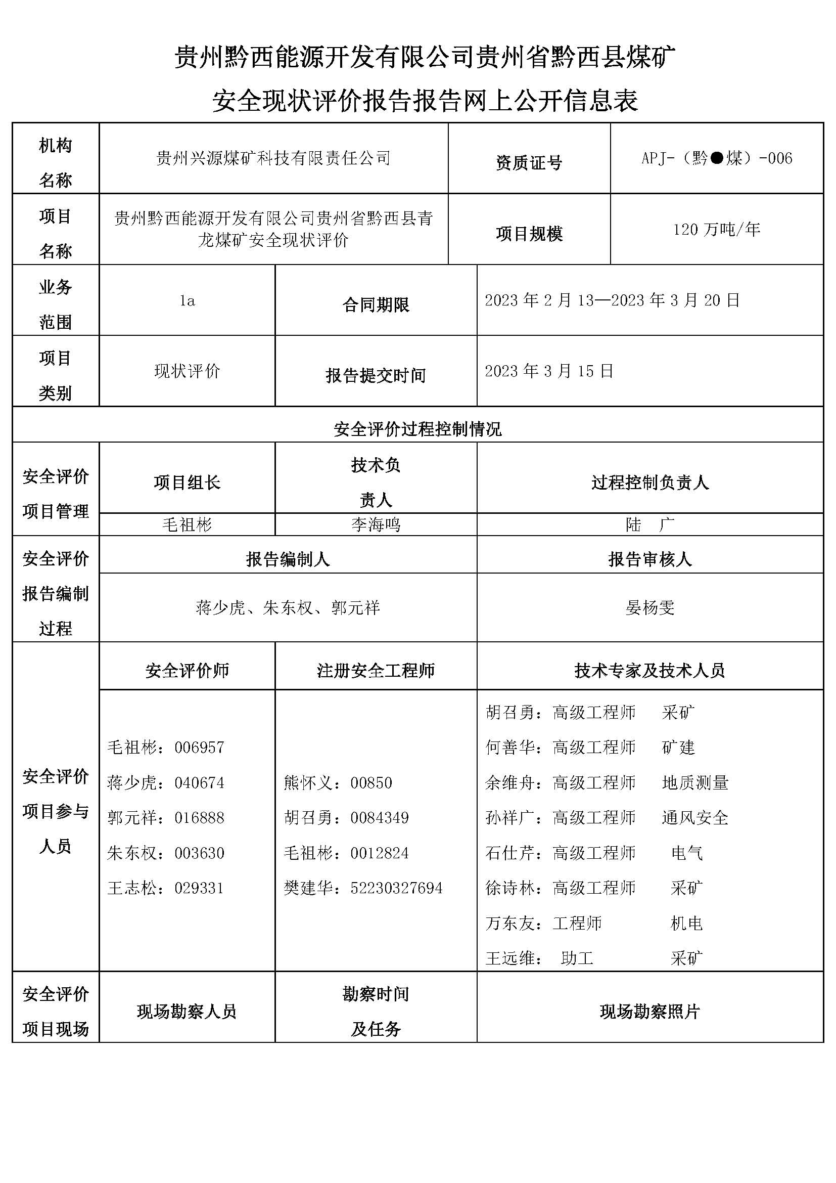 貴州黔西能源開發(fā)有限公司貴州省黔西縣煤礦安全現(xiàn)狀評價(jià)報(bào)告報(bào)告網(wǎng)上公開信息表
