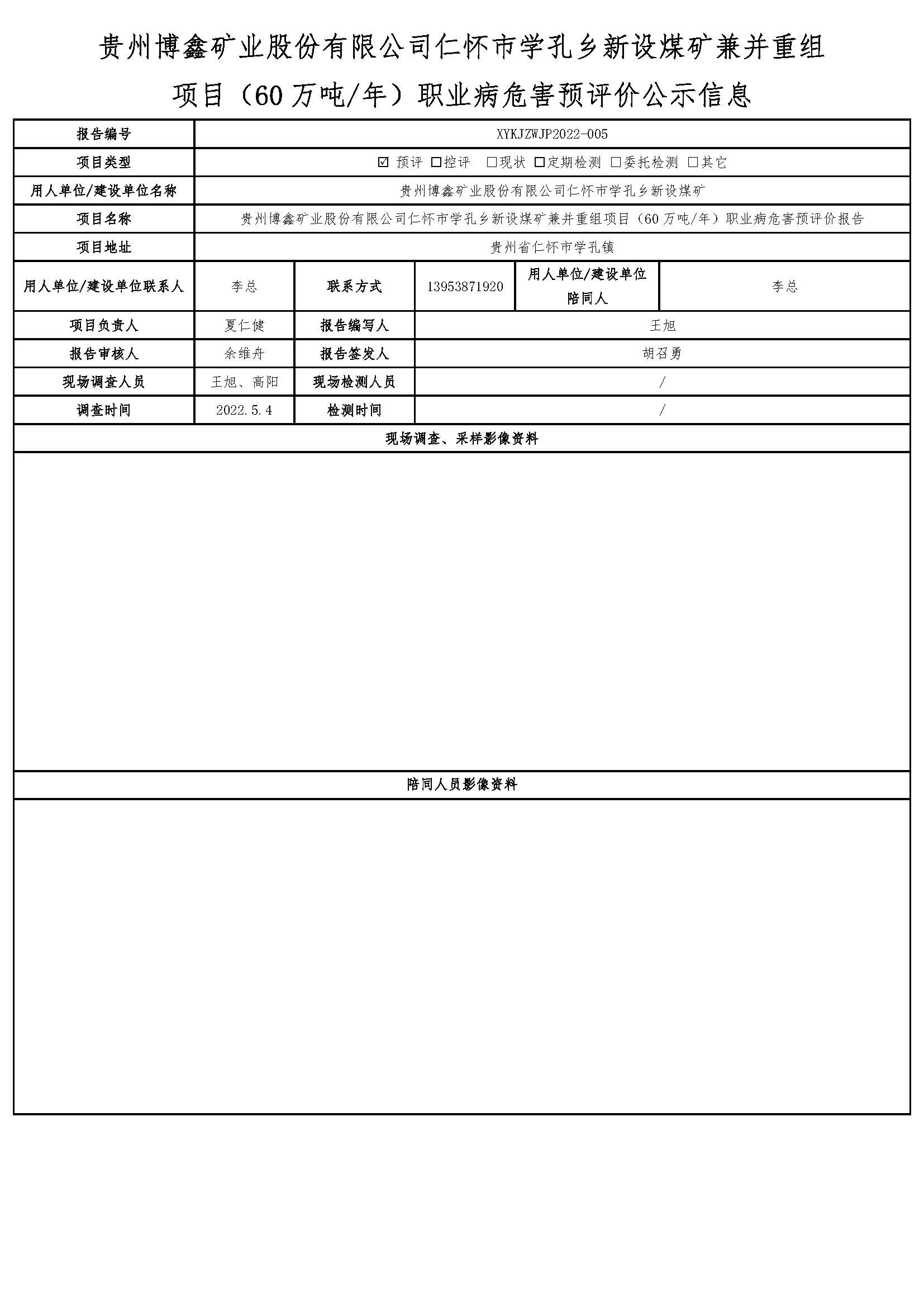 貴州博鑫礦業股份有限公司仁懷市學孔鄉新設煤礦兼并重組項目職業病危害預評價公示信息