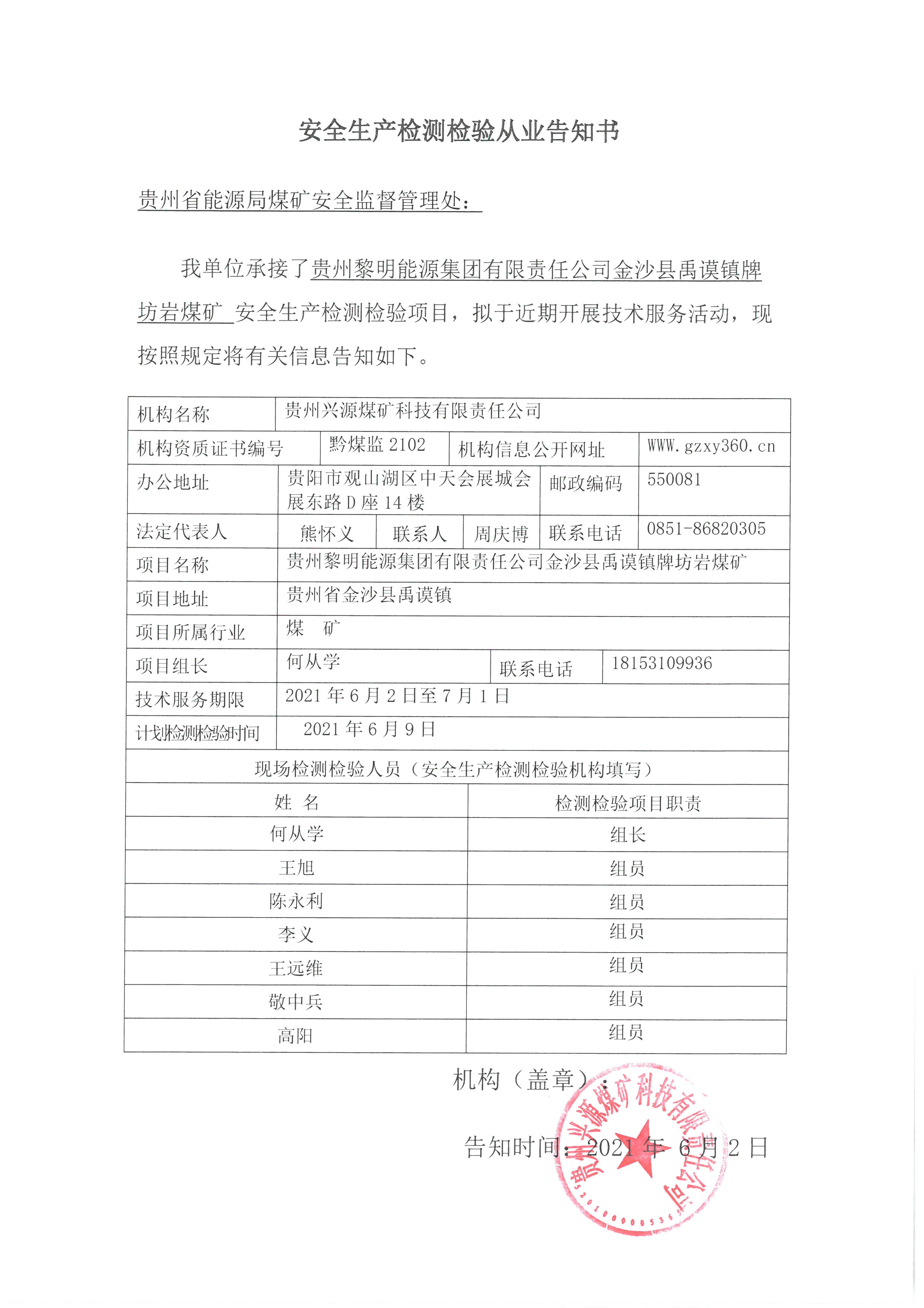 安全生產檢測檢驗從業告知書【貴州黎明能源集團有限責任公司金沙縣禹謨鎮牌坊巖煤礦】