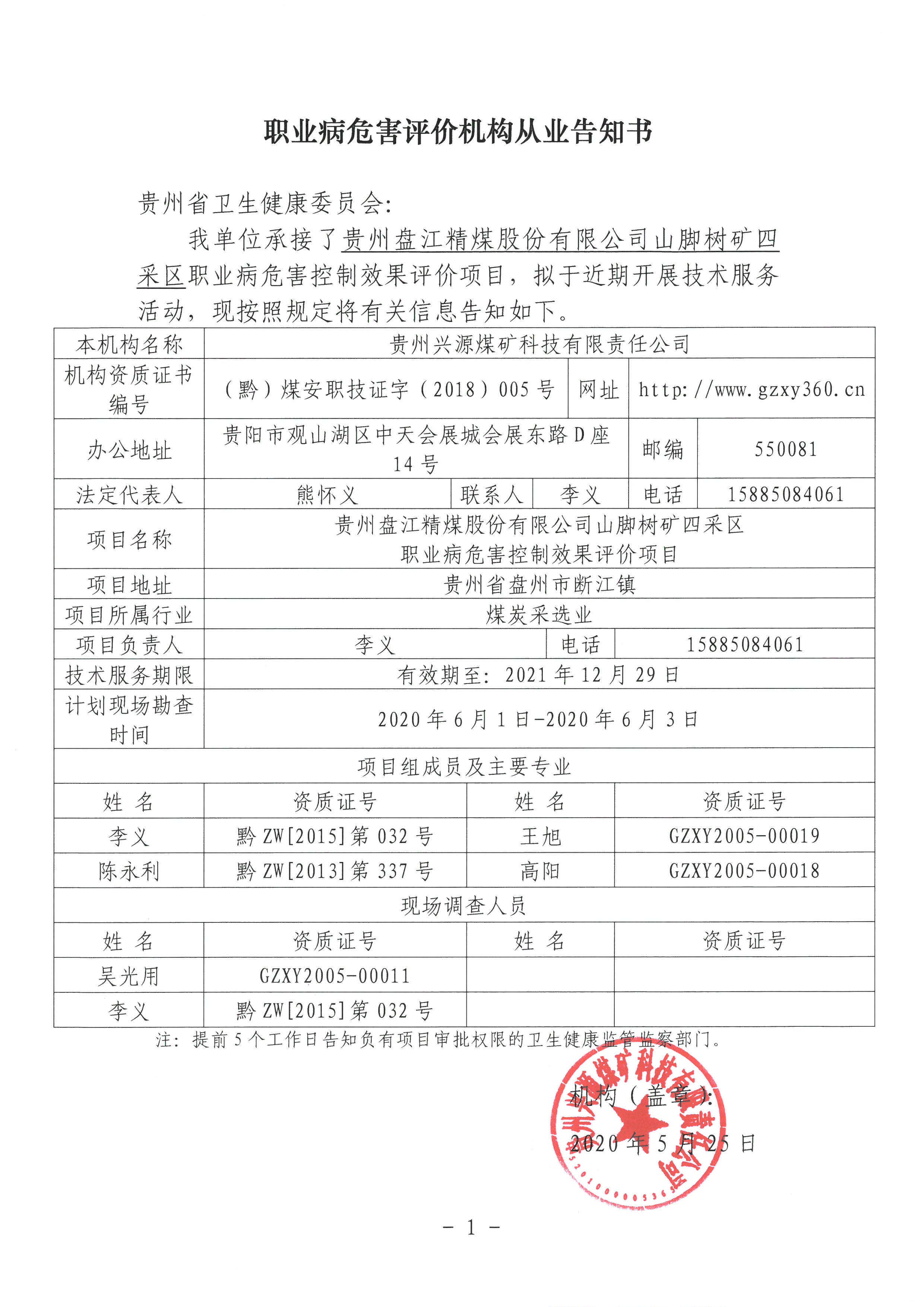 職業病危害評價機構從業告知書[貴州盤江精煤股份有限公司山腳樹煤礦四采區]