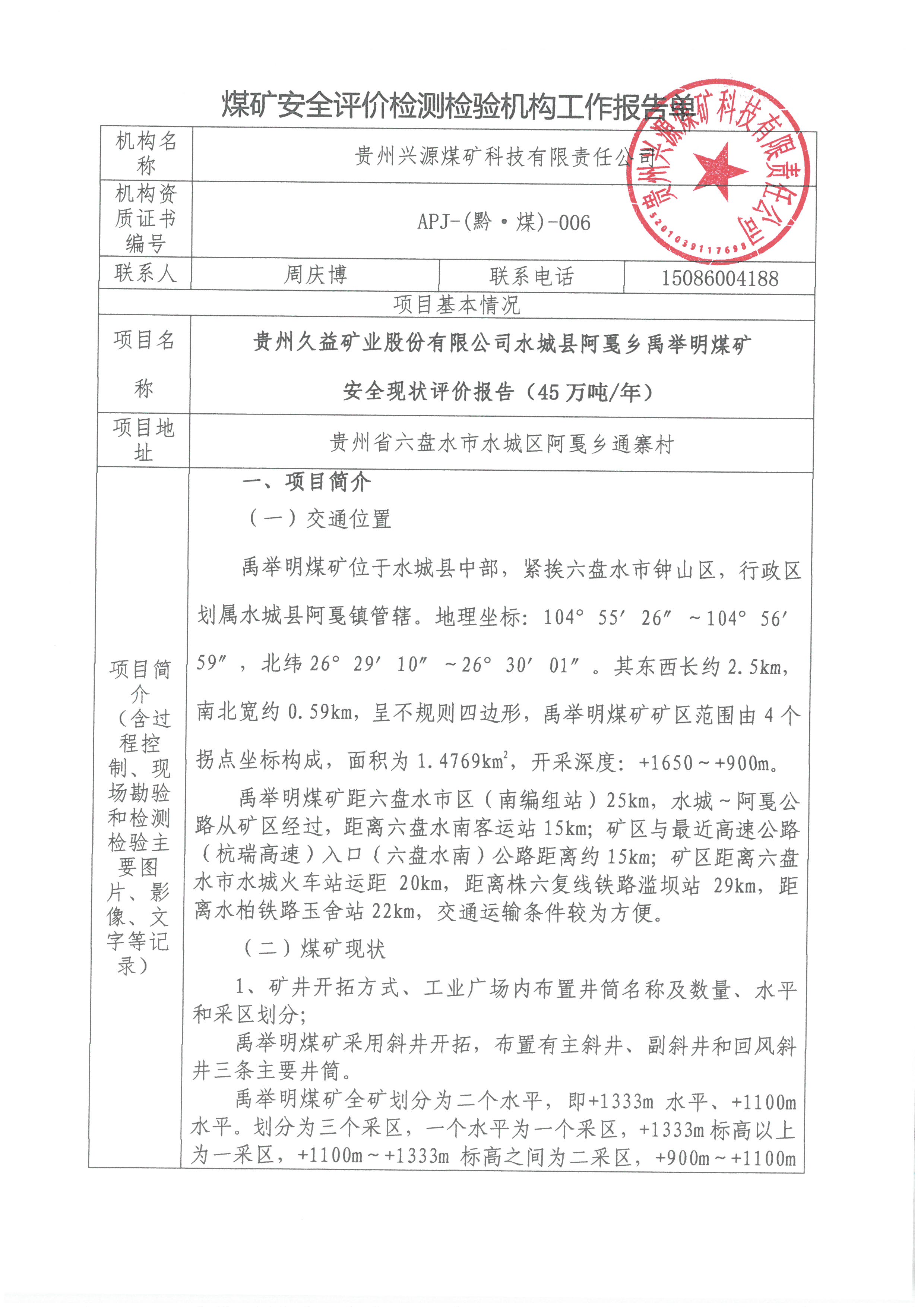 煤礦安全評價檢測檢驗機構工作報告單【貴州久益礦業股份有限公司水城縣阿戛鄉禹舉明煤礦 安全現狀評價報告(45萬噸/年)】