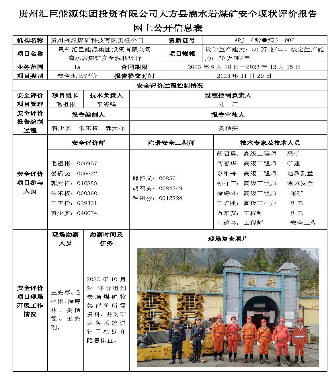 貴州匯巨能源集團(tuán)投資有限公司大方縣滴水巖煤礦安全現(xiàn)狀評價報告網(wǎng)上公開信息表