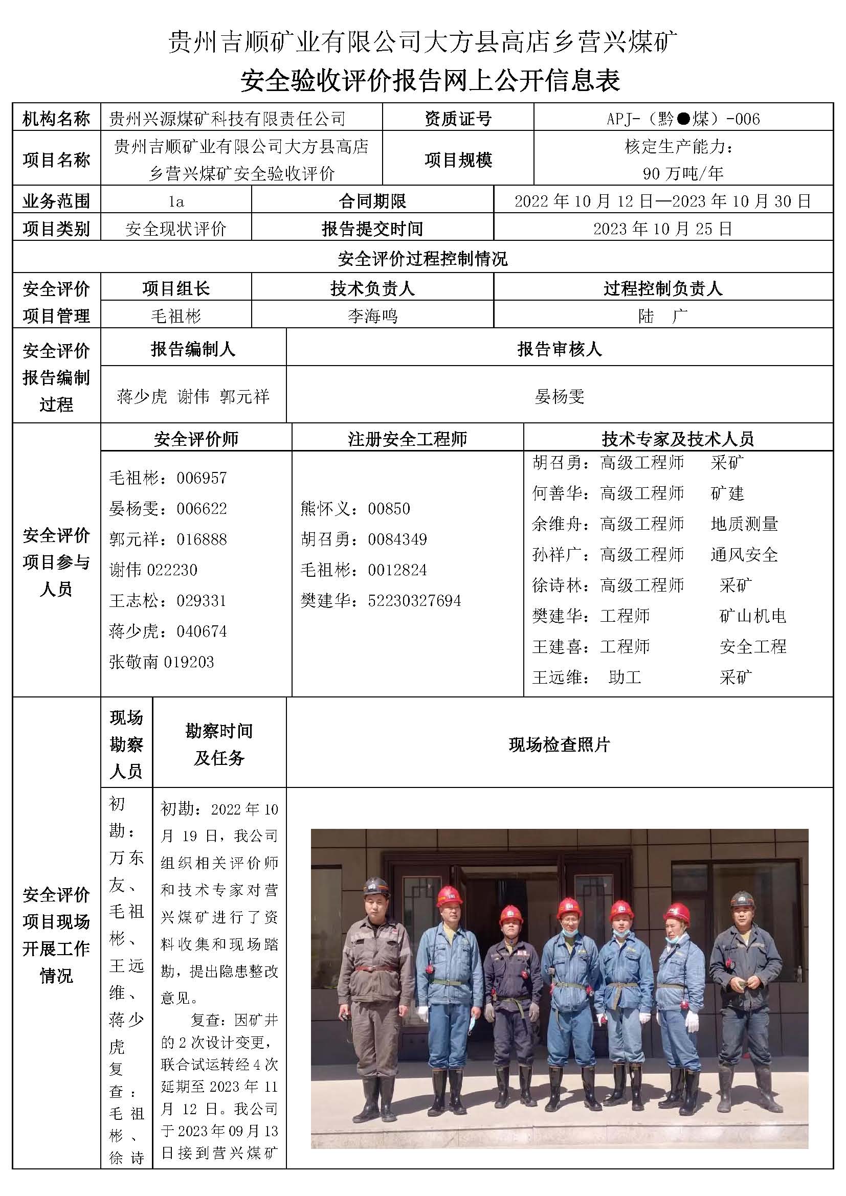 貴州吉順礦業(yè)有限公司大方縣高店鄉(xiāng)營興煤礦安全驗收評價報告網(wǎng)上公開信息表