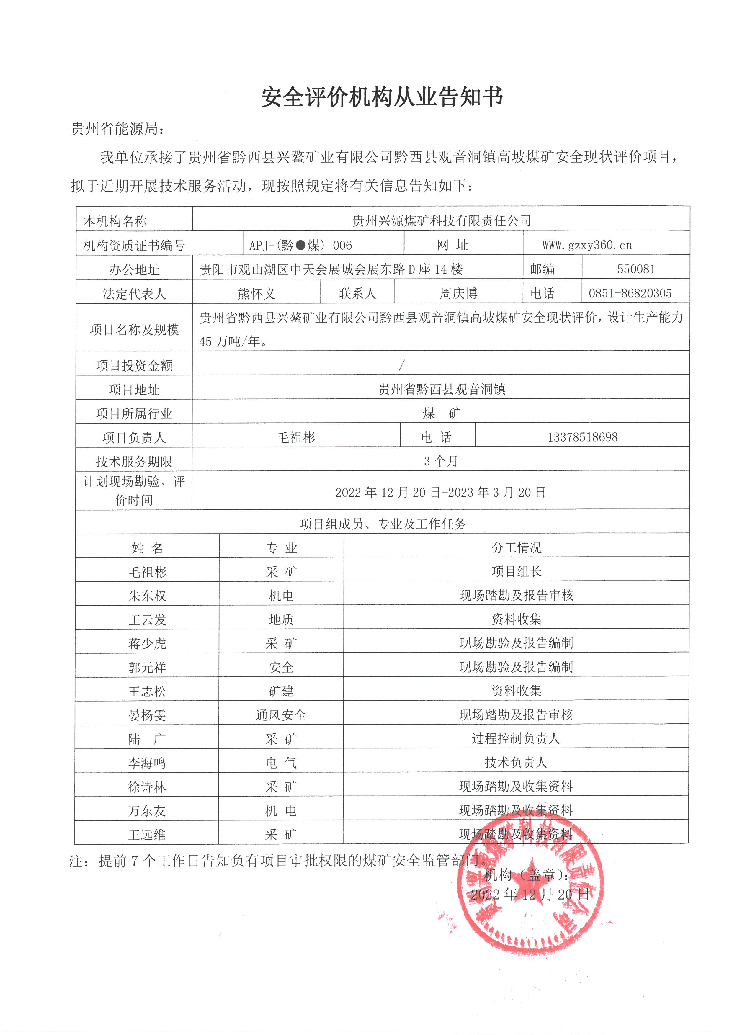 安全評價機構從業告知書【貴州省黔西縣興鰲礦業有限公司黔西縣觀音洞鎮高坡煤礦】
