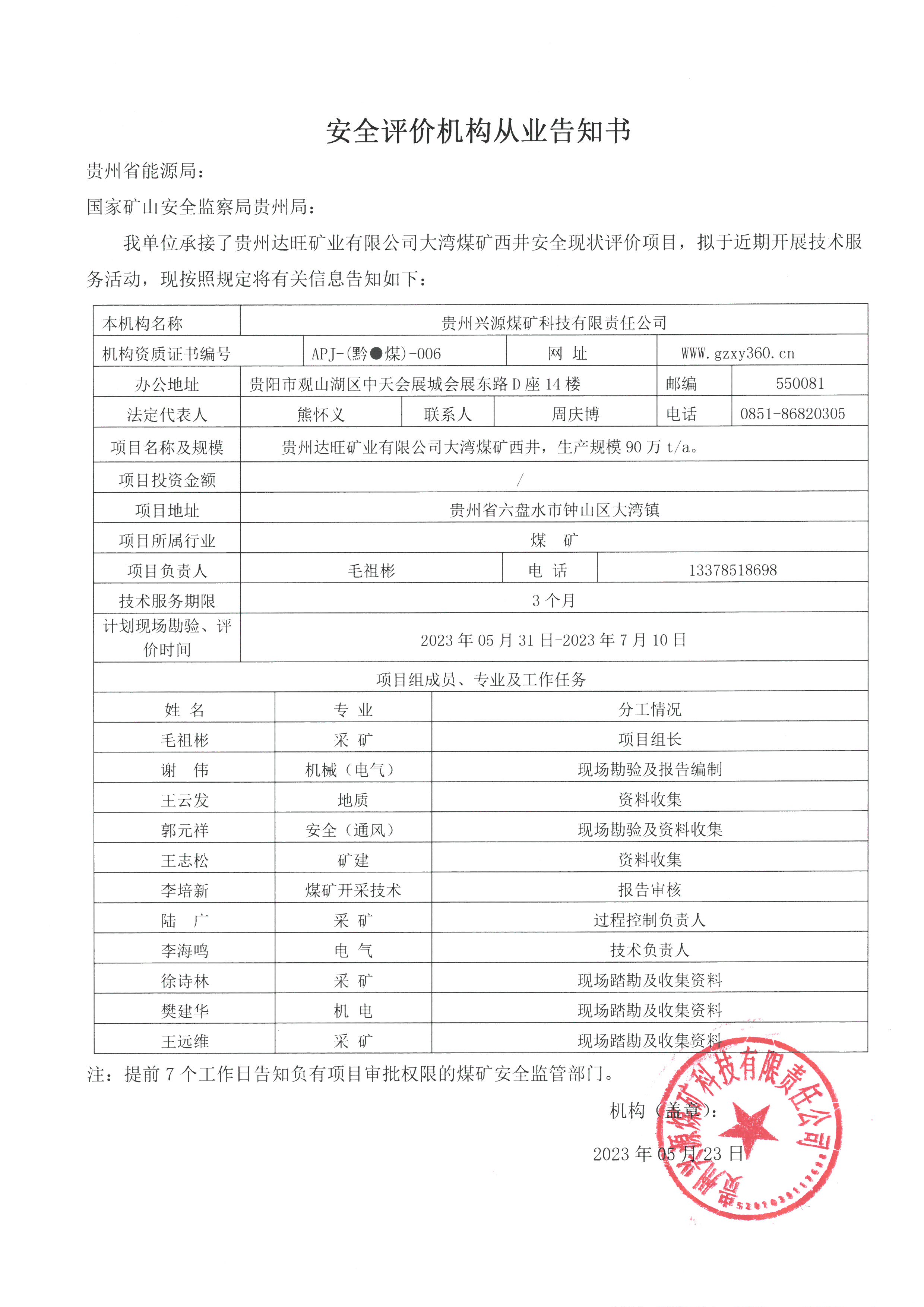 安全評價機構從業告知書【貴州達旺礦業有限公司大灣煤礦西井安全現狀評價】