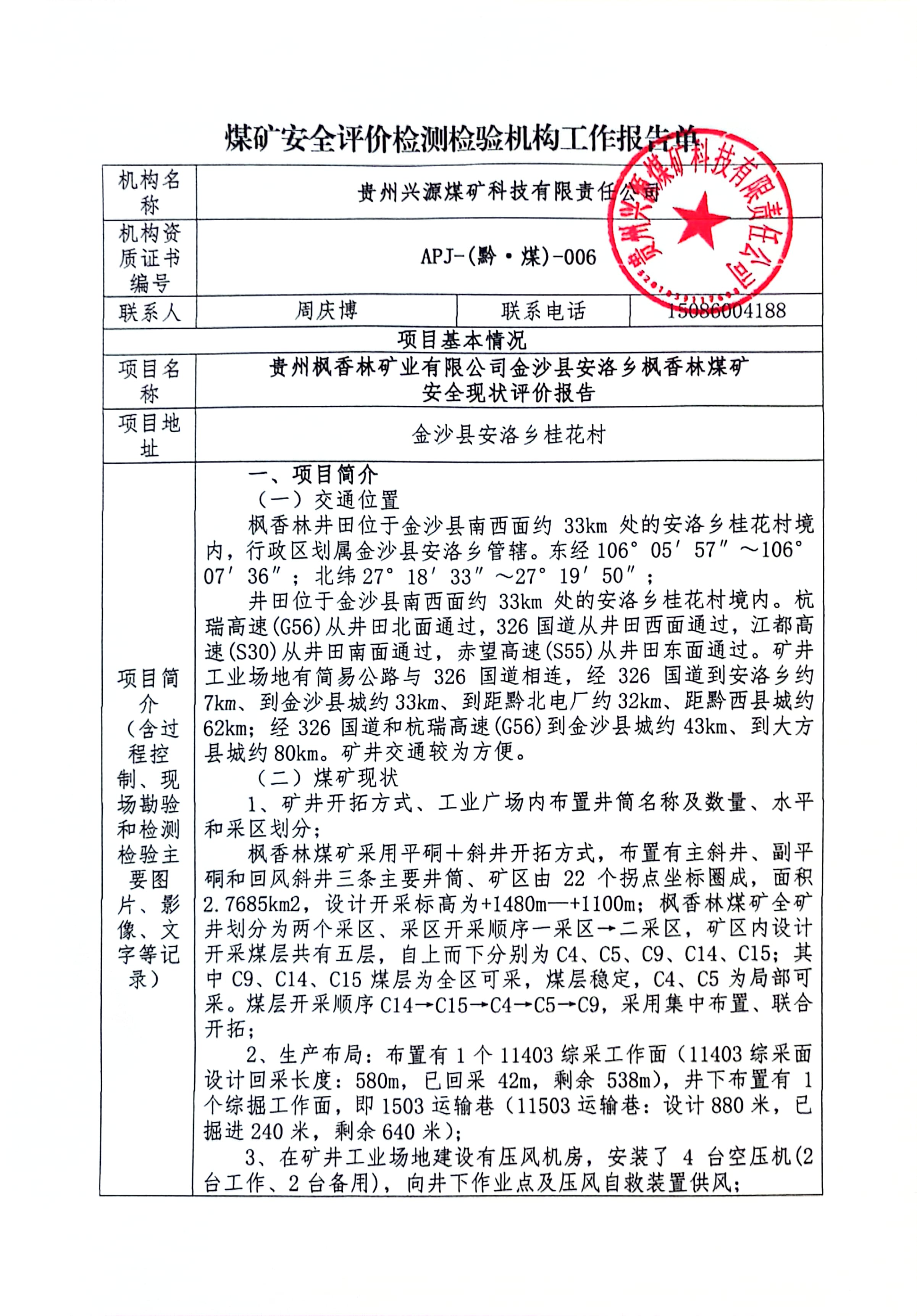 煤礦安全評價(jià)檢測檢驗(yàn)機(jī)構(gòu)工作報(bào)告單【貴州楓香林礦業(yè)有限公司 金沙縣安洛鄉(xiāng)楓香林煤礦 安全現(xiàn)狀評價(jià)報(bào)告】