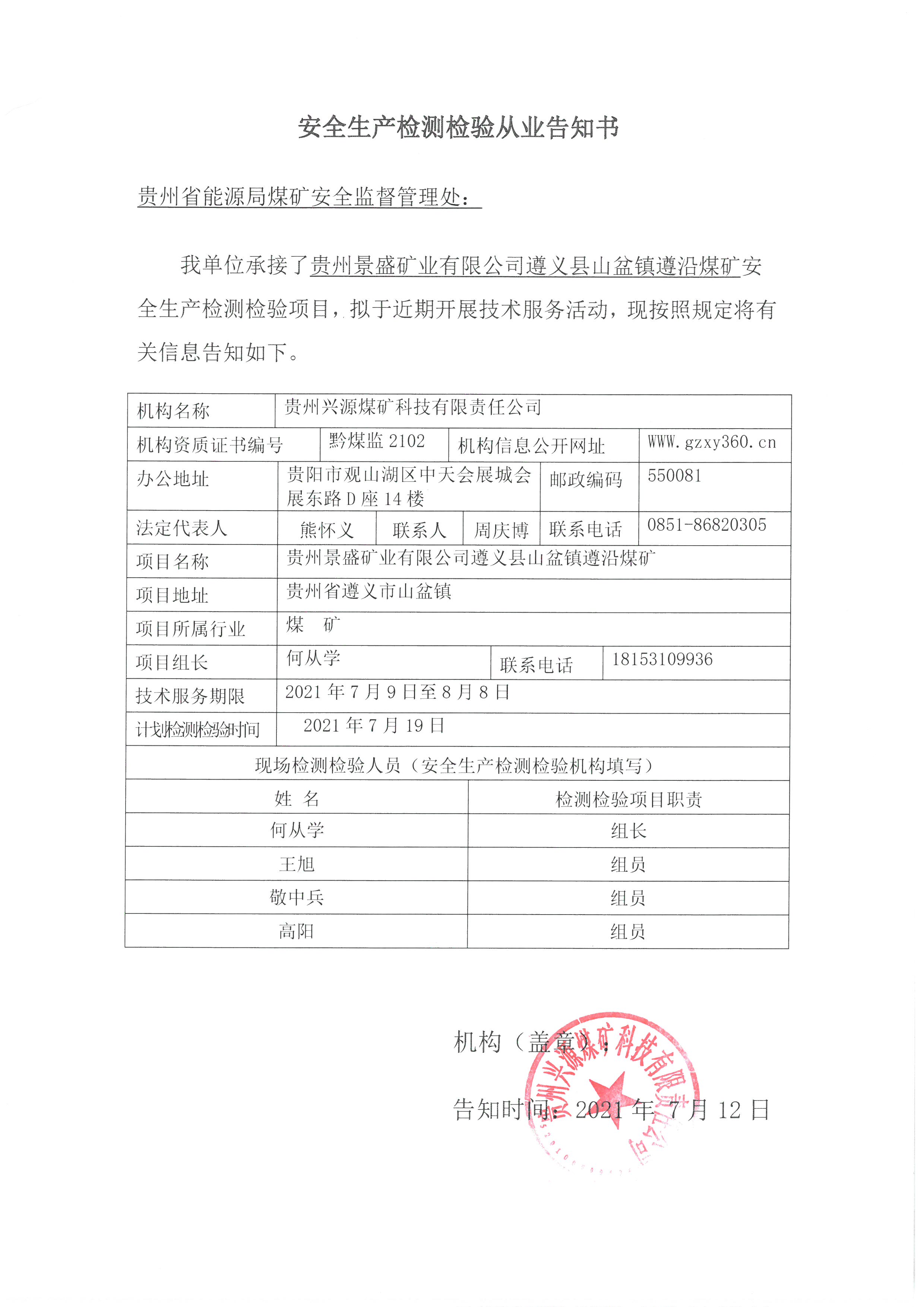 安全生產(chǎn)檢測檢驗從業(yè)告知書【貴州景盛礦業(yè)有限公司遵義縣山盆鎮(zhèn)遵沿煤礦】