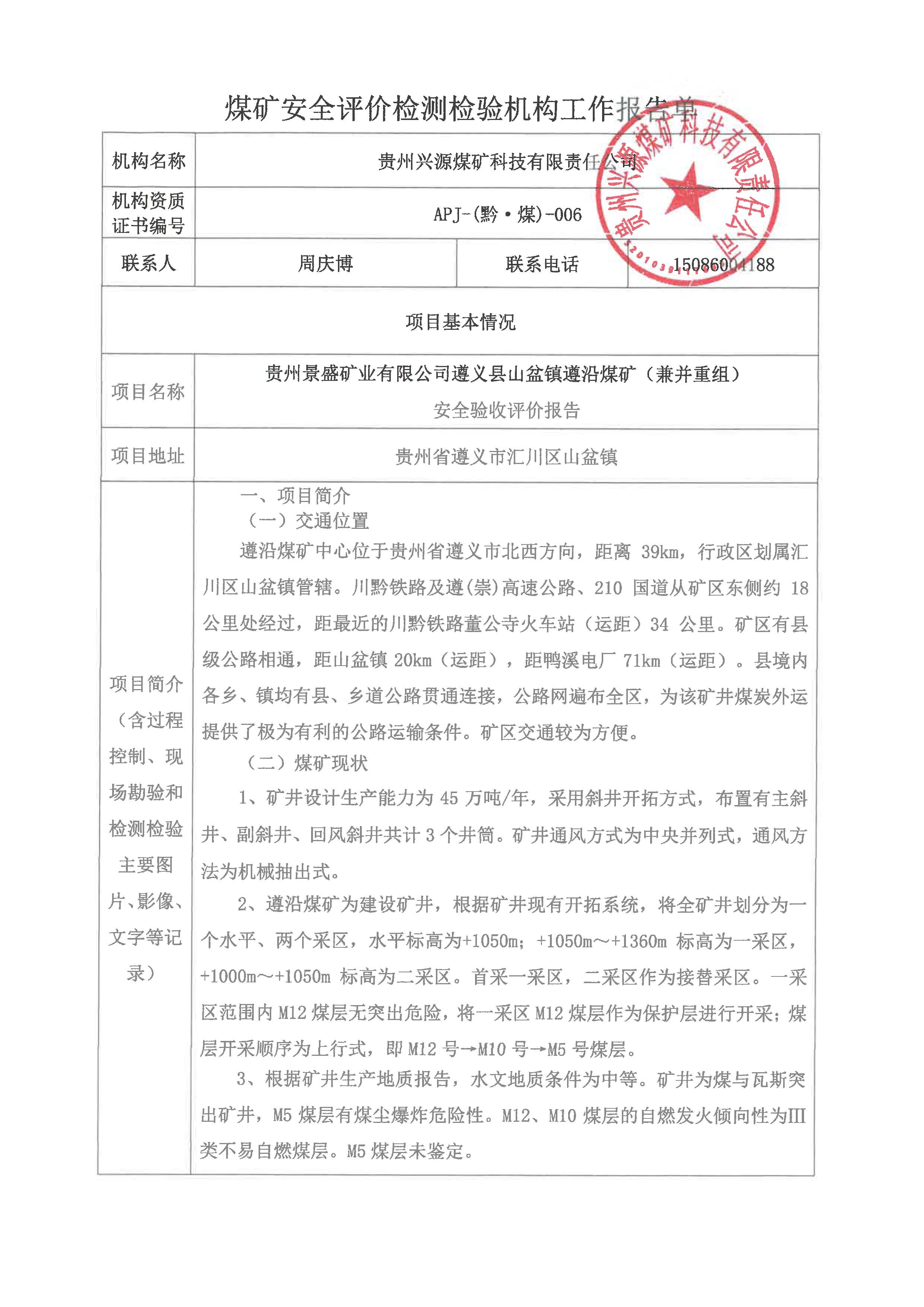 煤礦安全評價檢測檢驗機構(gòu)工作報告單【貴州景盛礦業(yè)有限公司遵義縣山盆鎮(zhèn)遵沿煤礦(兼并重組) 安全驗收評價報告】