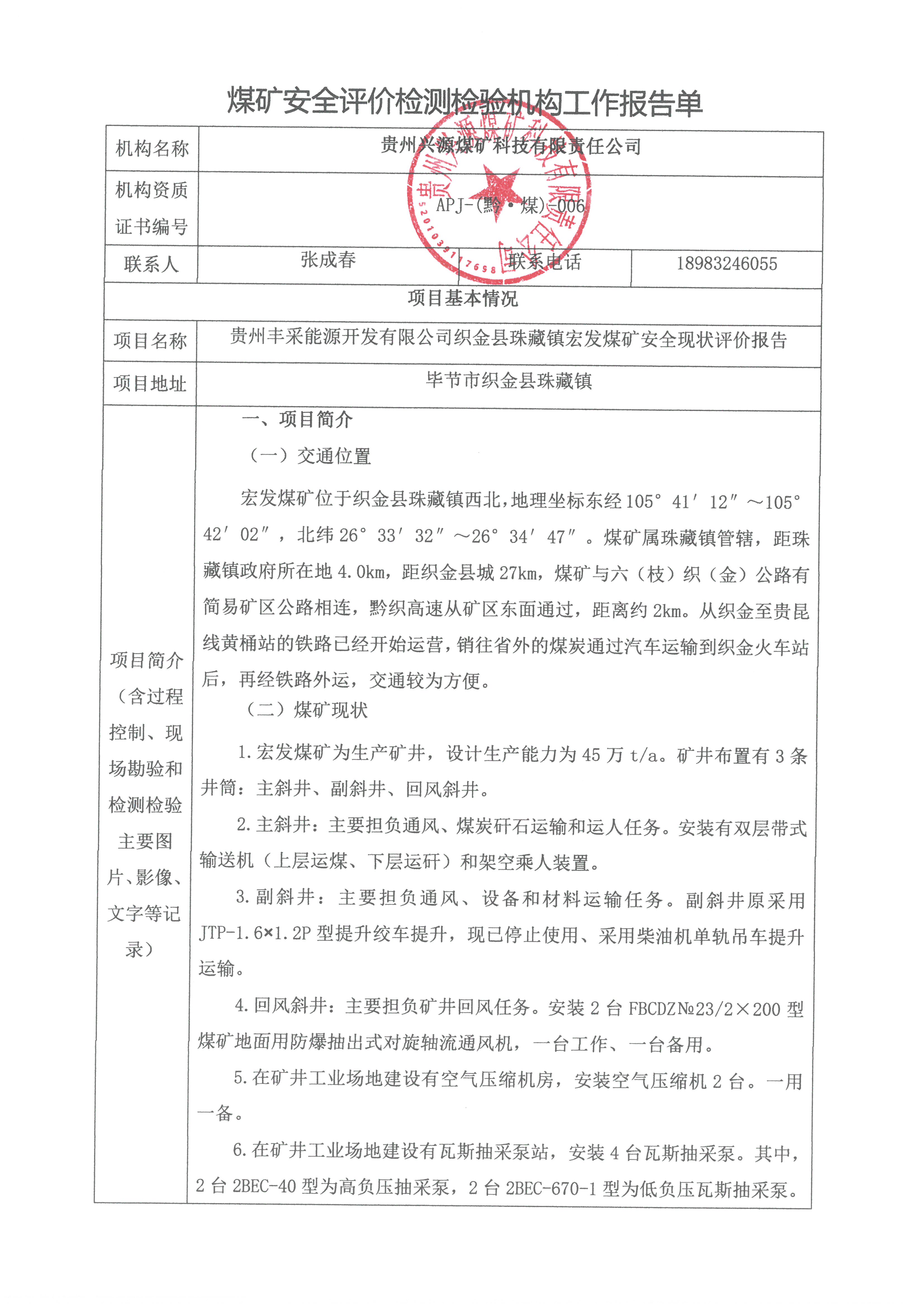 煤礦安全評價檢測檢驗機構(gòu)工作報告單【貴州豐采能源開發(fā)有限公司織金縣珠藏鎮(zhèn)宏發(fā)煤礦安全現(xiàn)狀評價報告】