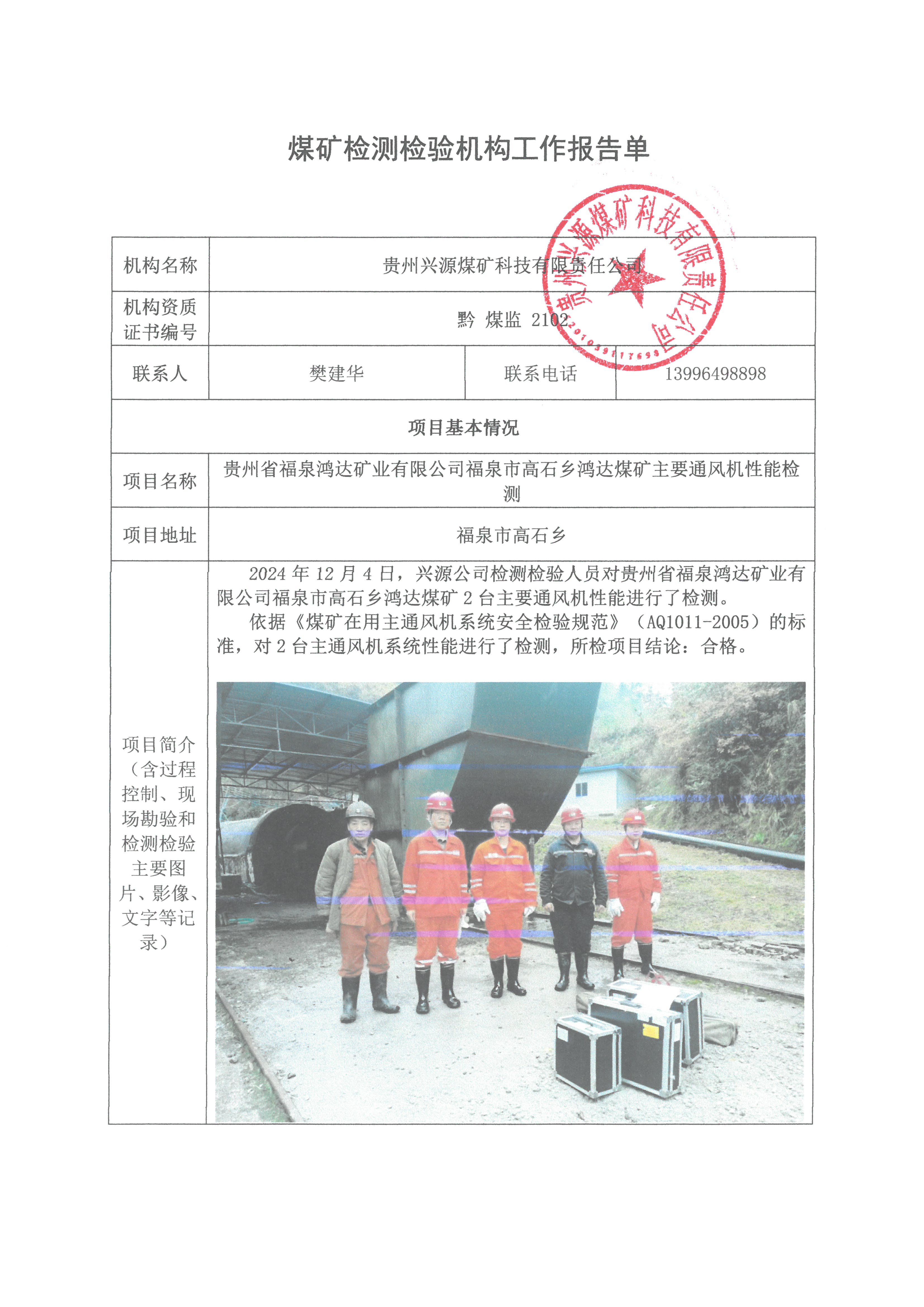 煤礦檢測檢驗機構(gòu)工作報告單【貴州省福泉鴻達礦業(yè)有限公司福泉市高石鄉(xiāng)鴻達煤礦主要通風(fēng)機性能檢測】