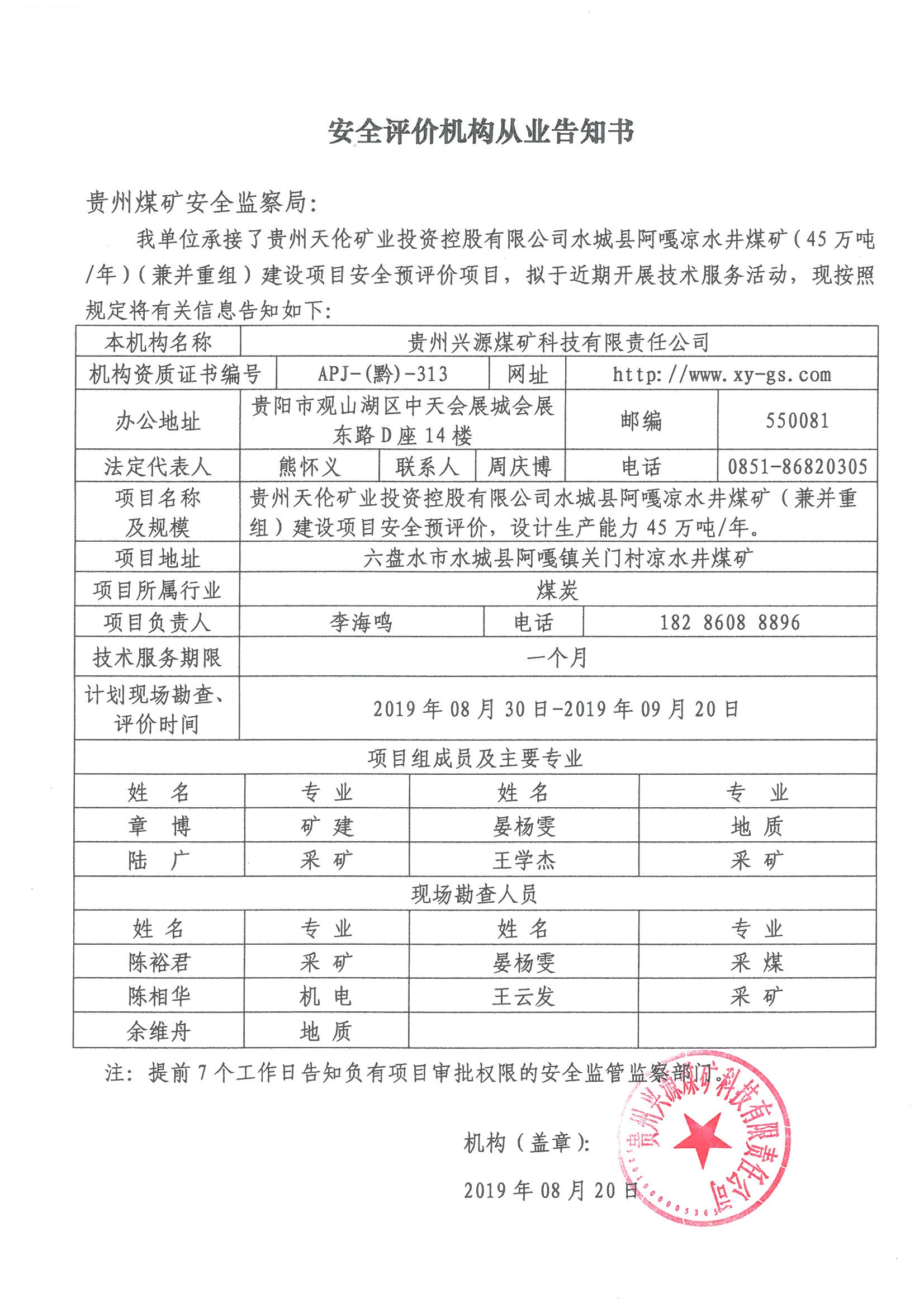 安全評(píng)價(jià)機(jī)構(gòu)從業(yè)告知書(shū)[貴州天倫礦業(yè)投資控股有限公司水城縣阿嘎涼水井煤礦]