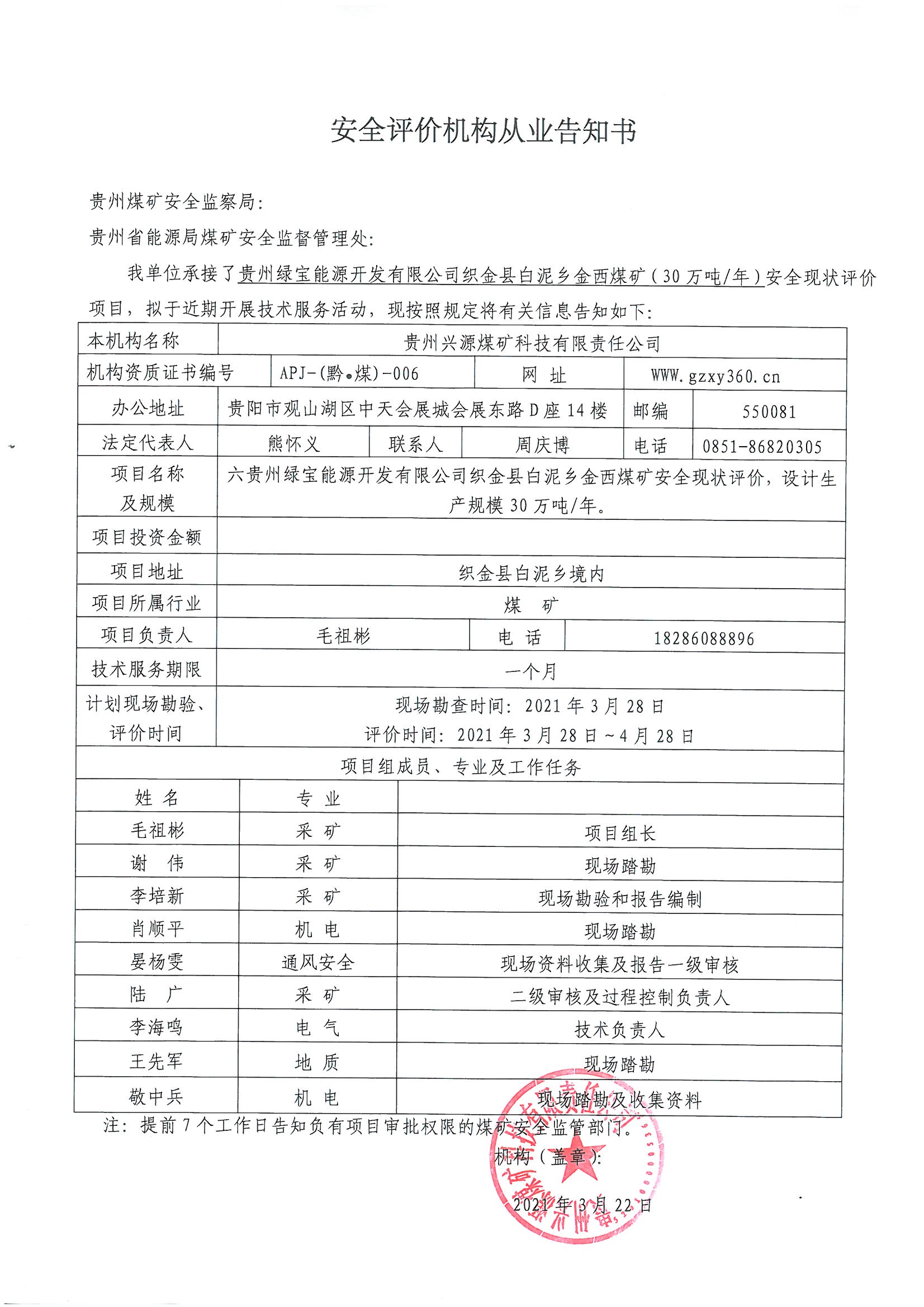 安全評(píng)價(jià)機(jī)構(gòu)從業(yè)告知書(shū)(貴州綠寶能源開(kāi)發(fā)有限公司織金縣白泥鄉(xiāng)金西煤礦)