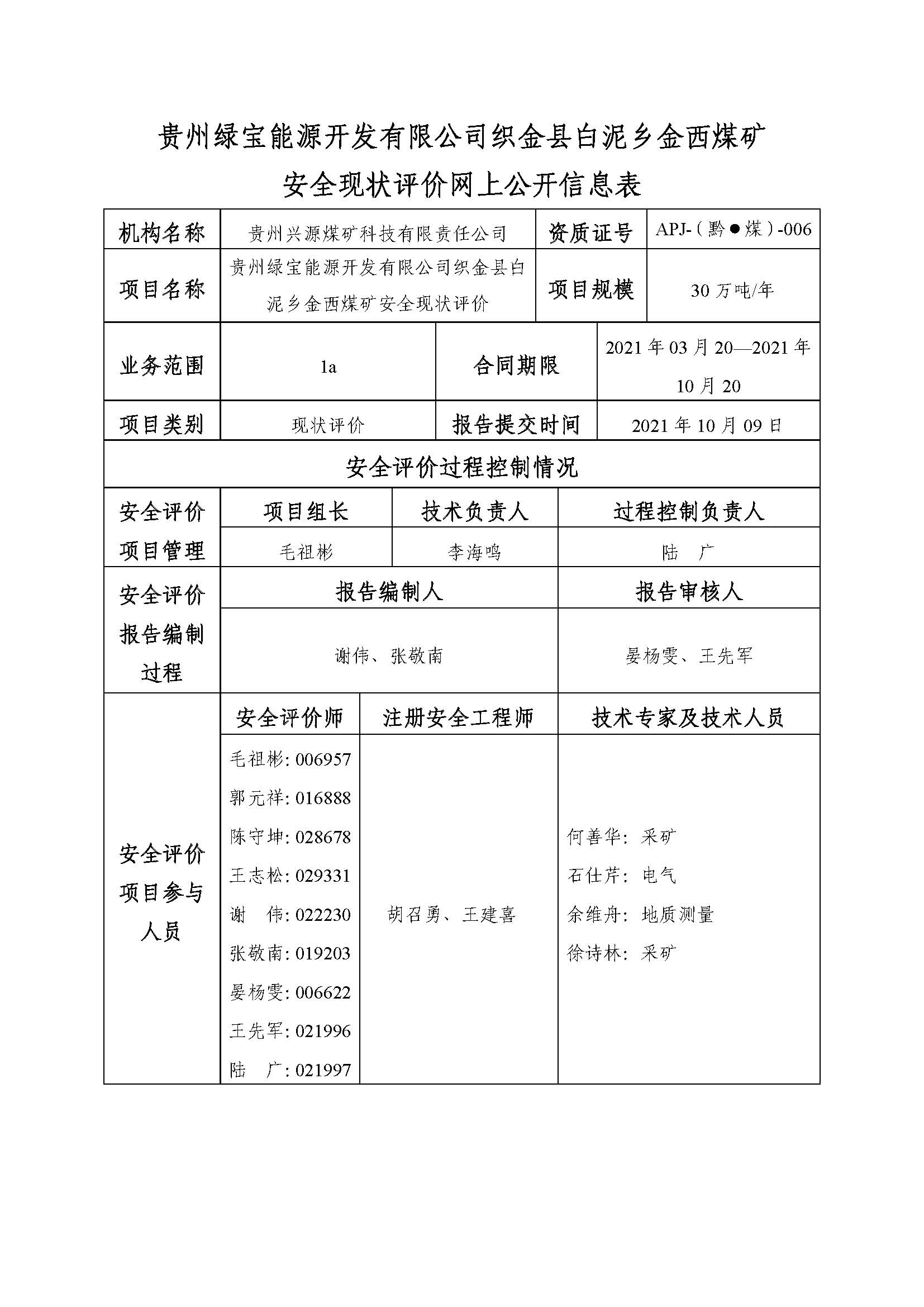 貴州綠寶能源開(kāi)發(fā)有限公司織金縣白泥鄉(xiāng)金西煤礦安全現(xiàn)狀評(píng)價(jià)網(wǎng)上公開(kāi)信息表
