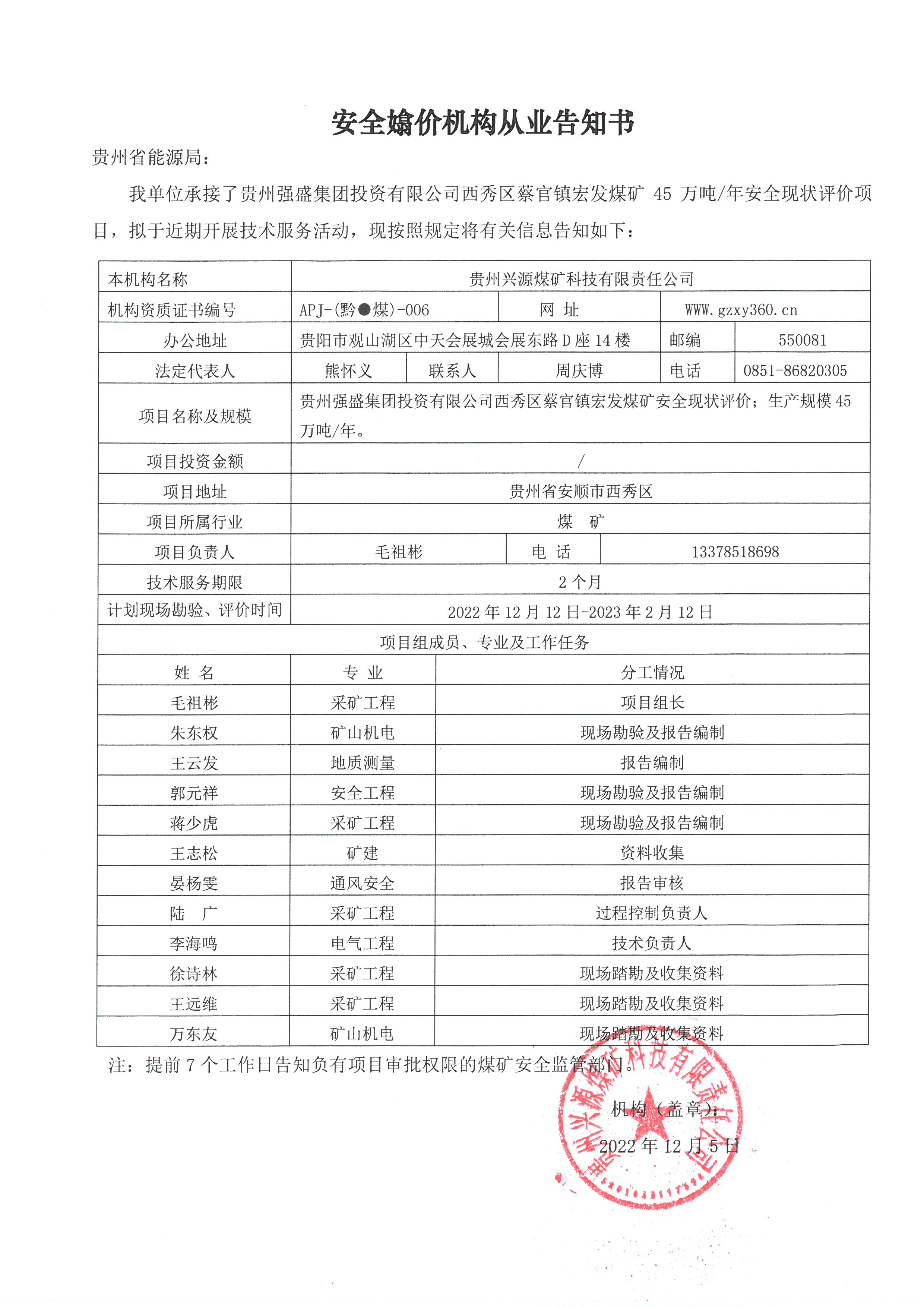 煤礦安全評(píng)價(jià)機(jī)構(gòu)從業(yè)告知書(shū)【貴州強(qiáng)盛集團(tuán)投資有限公司西秀區(qū)蔡官鎮(zhèn)宏發(fā)煤礦】