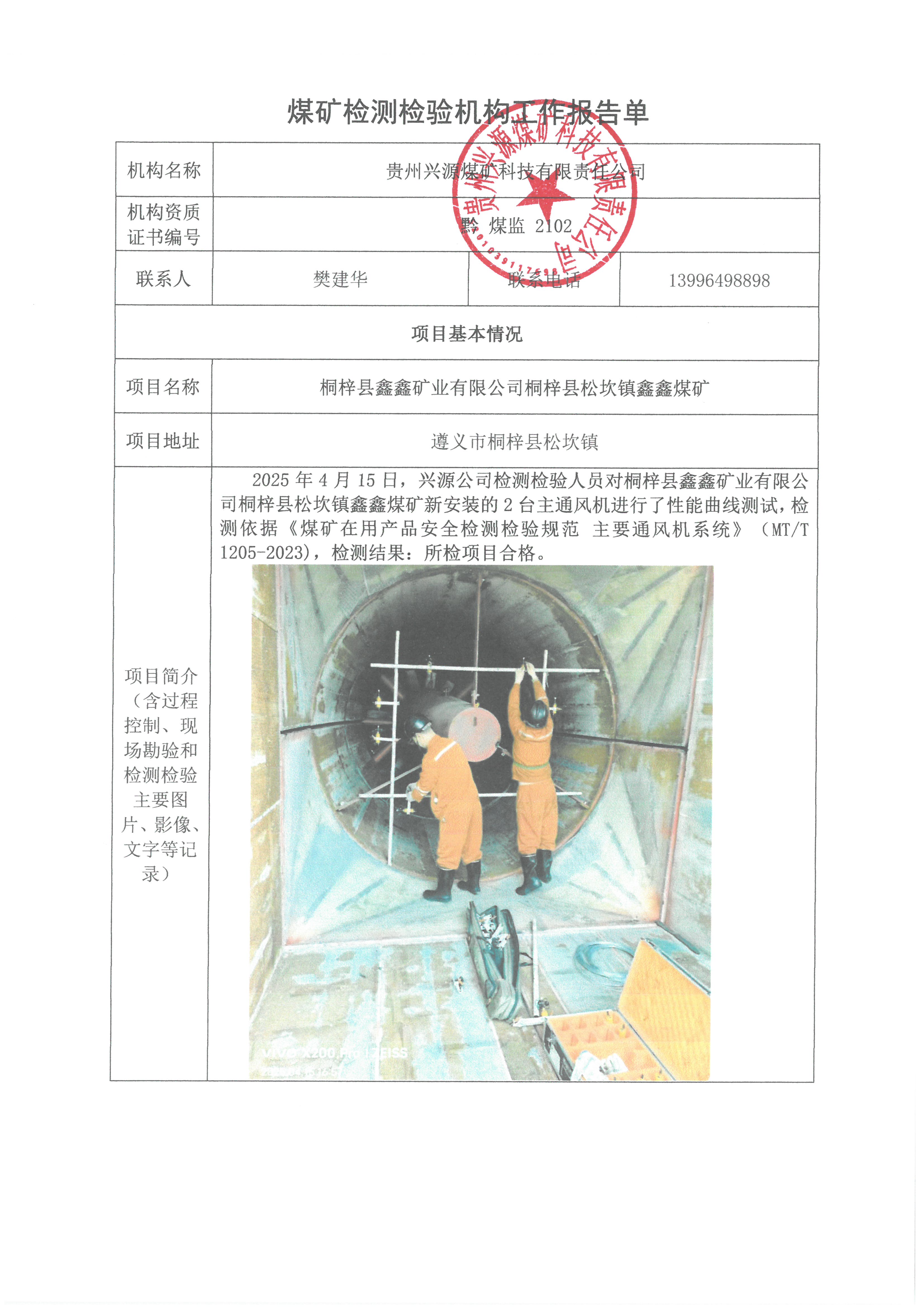 煤礦檢測檢驗機構工作報告單【桐梓縣鑫鑫礦業有限公司桐梓縣松坎鎮鑫鑫煤礦】