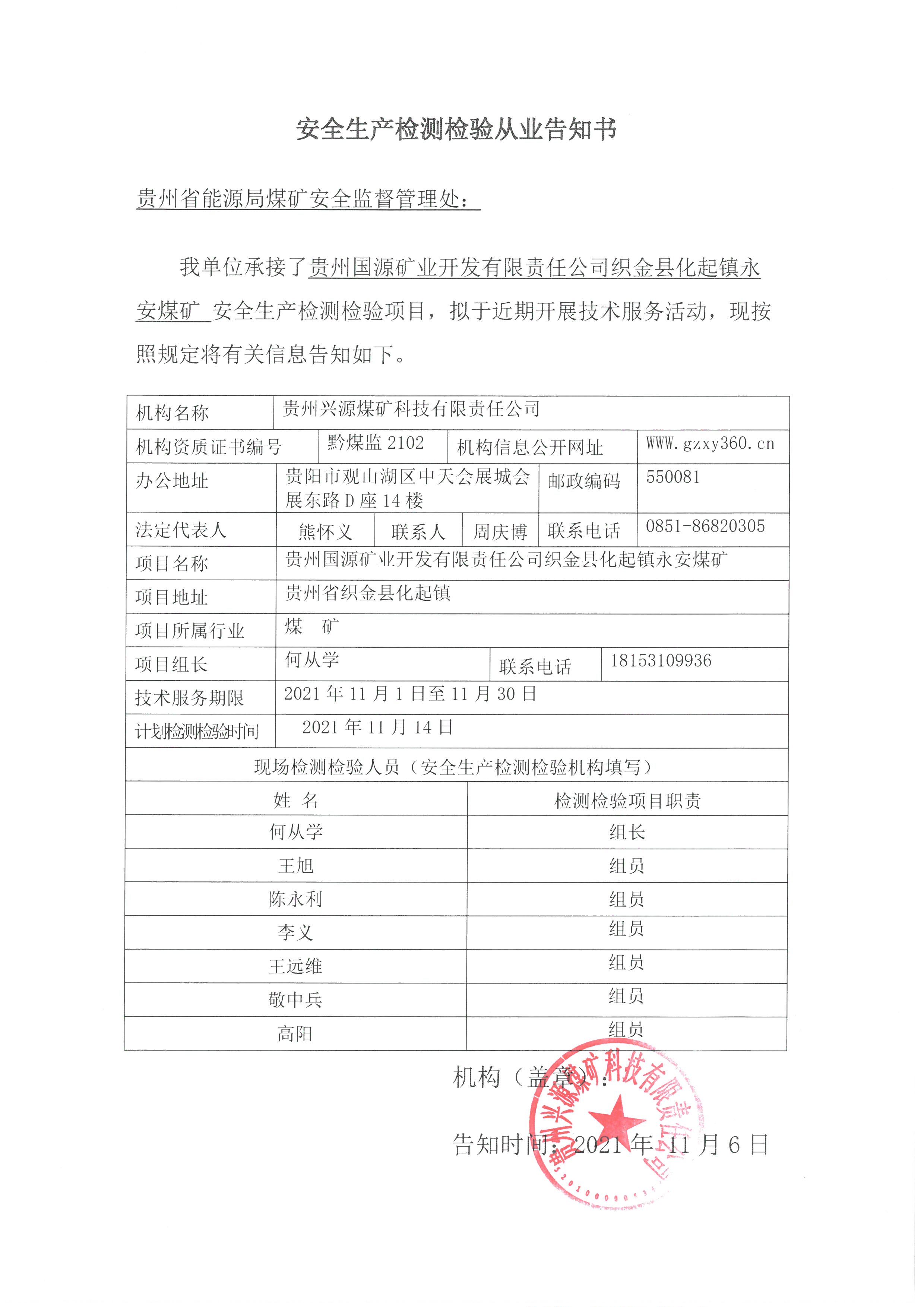 安全生產(chǎn)檢測(cè)檢驗(yàn)從業(yè)告知書【貴州國源礦業(yè)開發(fā)有限責(zé)任公司織金縣化起鎮(zhèn)永安煤礦】