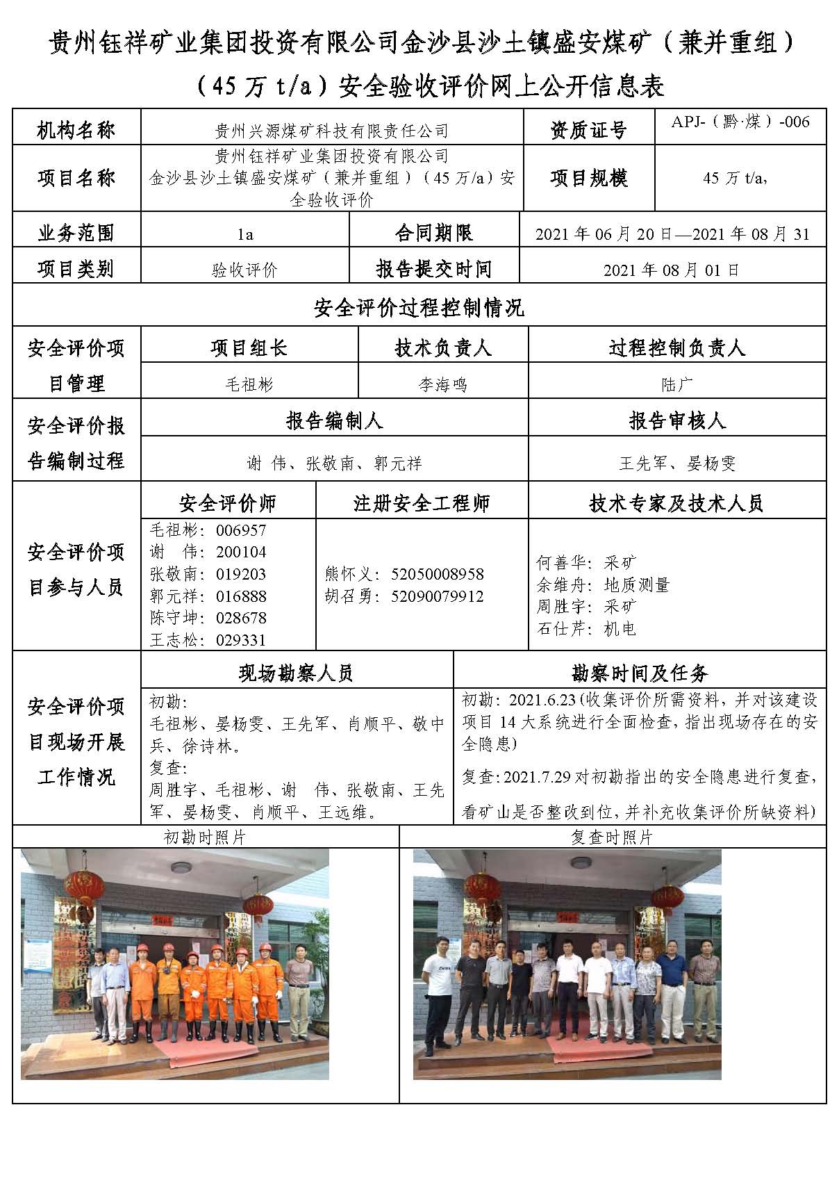 貴州鈺祥礦業集團投資有限公司金沙縣沙土鎮盛安煤礦(兼并重組)(45萬t/a)安全驗收評價網上公開信息表