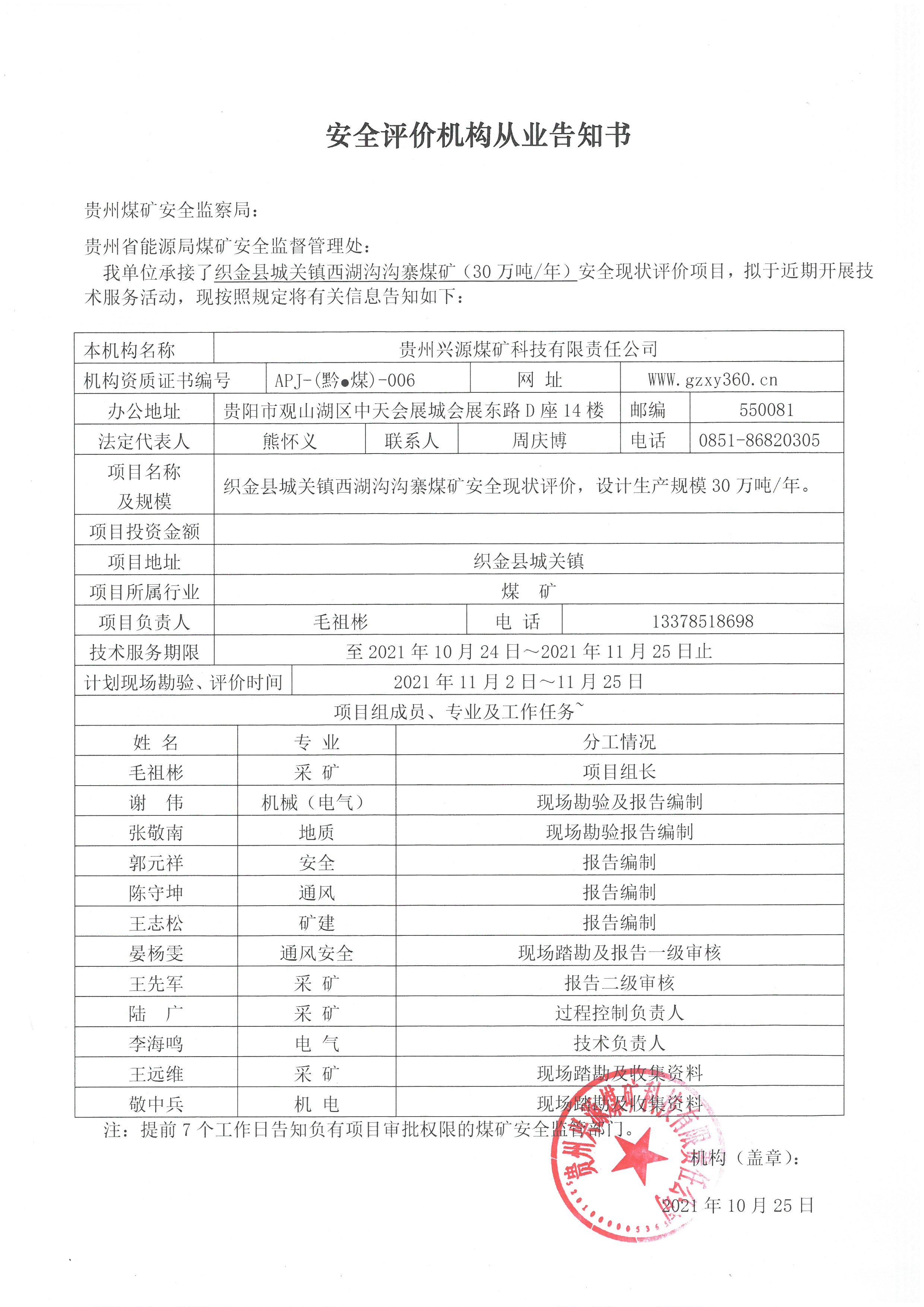 安全評價機構從業告知書(織金縣城關鎮西湖溝溝寨煤礦(30萬噸/年)安全現狀評價)