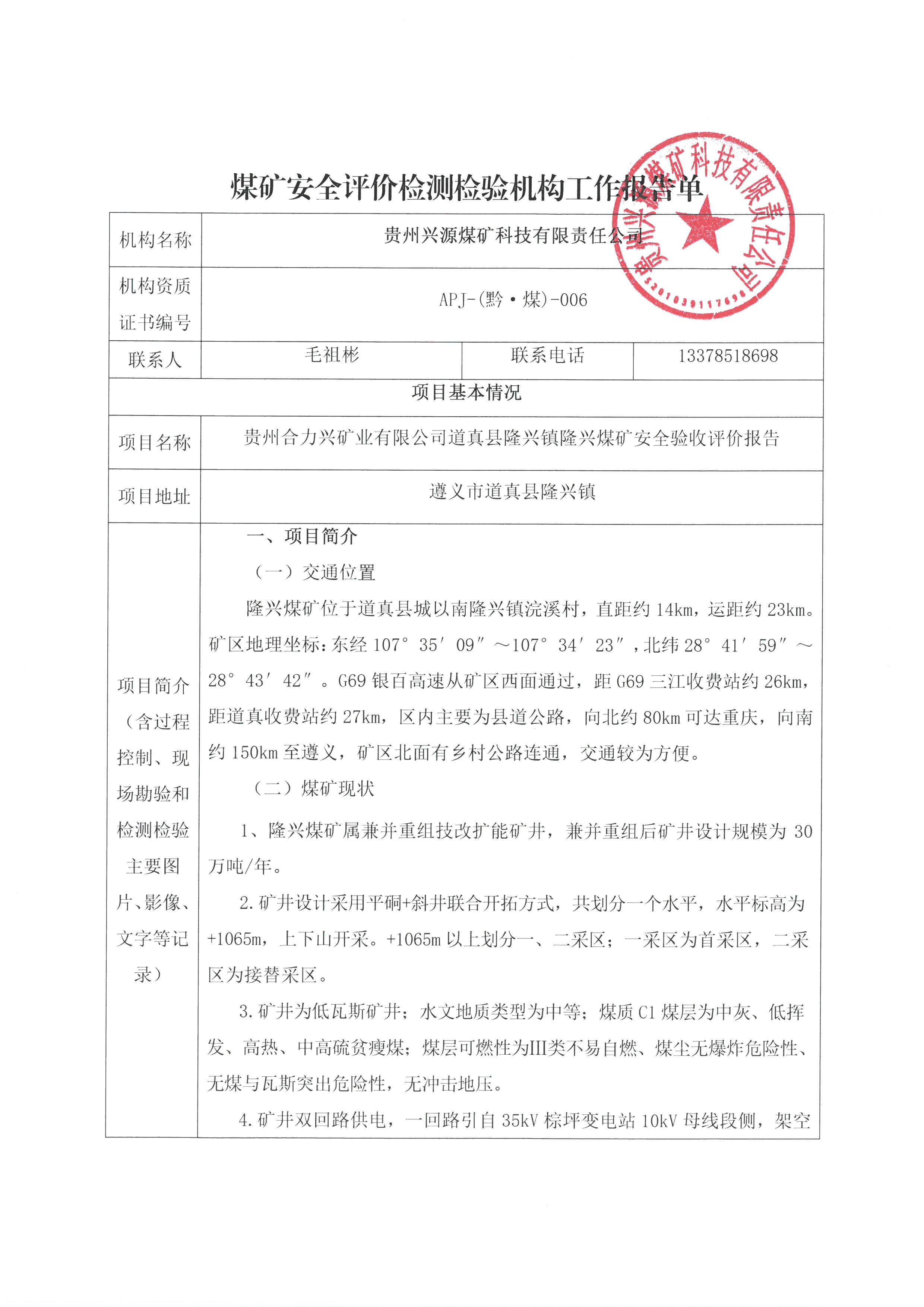 煤礦安全評價檢測檢驗機構工作報告單【貴州合力興礦業有限公司道真縣隆興鎮隆興煤礦安全驗收評價報告】