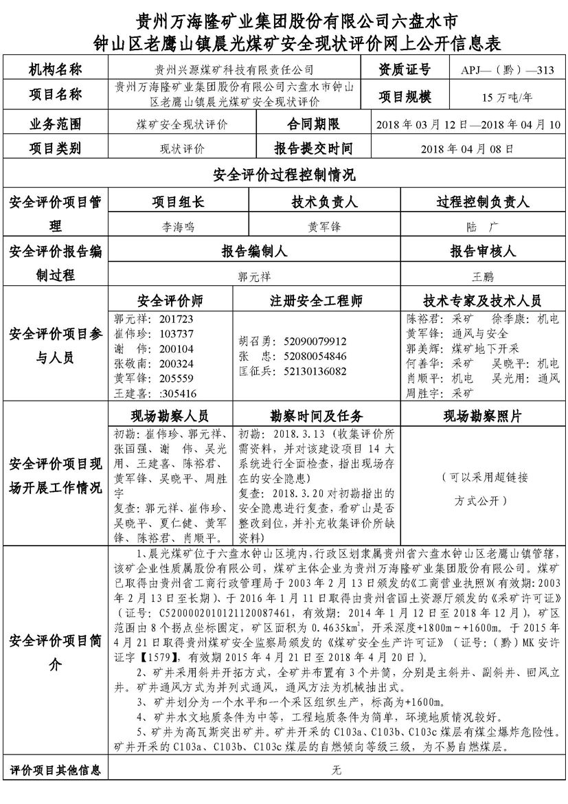 貴州萬海隆礦業集團股份有限公司六盤水市鐘山區老鷹山鎮晨光煤礦安全現狀評價網上公開信息表